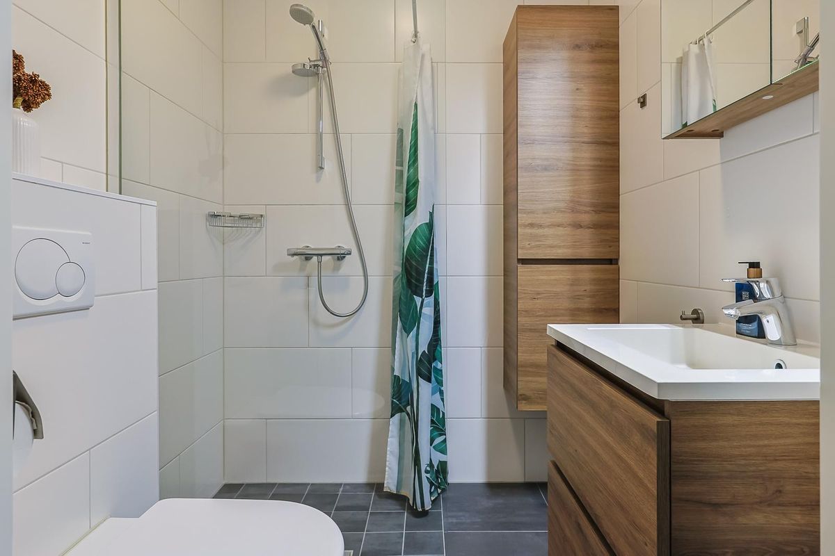 De slaapkamer ligt aan de rustige galerijzijde en beschikt over een vaste schuifkastenwand. De badkamer is fris afgewerkt in grijs-witte tinten en biedt een douchehoek, wastafelmeubel in houtlook en een vrijhangend toilet.
