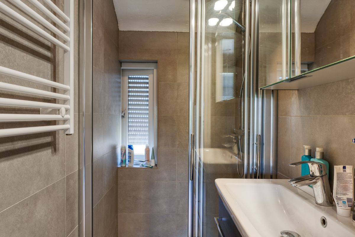 De moderne badkamer is volledig betegeld en voorzien van een ruime inloopdouche, een wastafelmeubel en praktische opbergruimte. Dankzij het raam geniet je hier van natuurlijk licht en ventilatie. De gehele verdieping is voorzien van rolluiken, wat niet alleen zorgt voor verduistering, maar ook bijdraagt aan een aangenaam binnenklimaat en extra veiligheid.