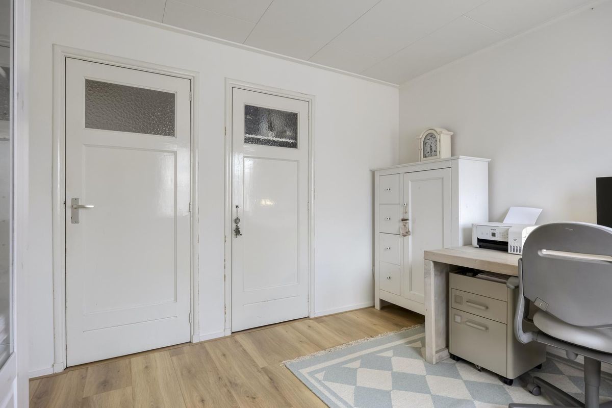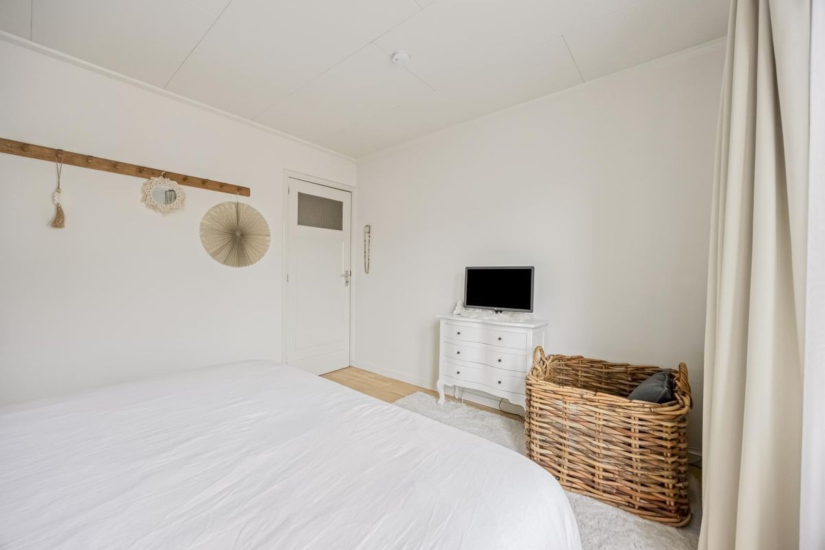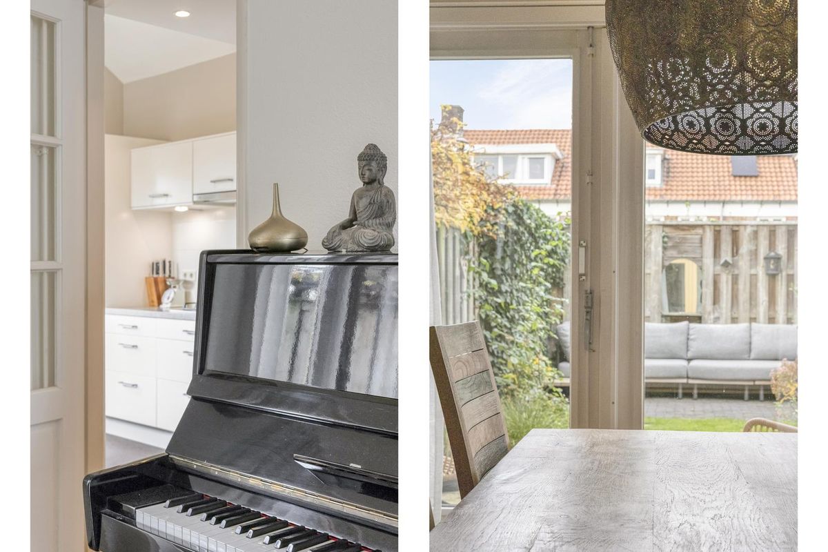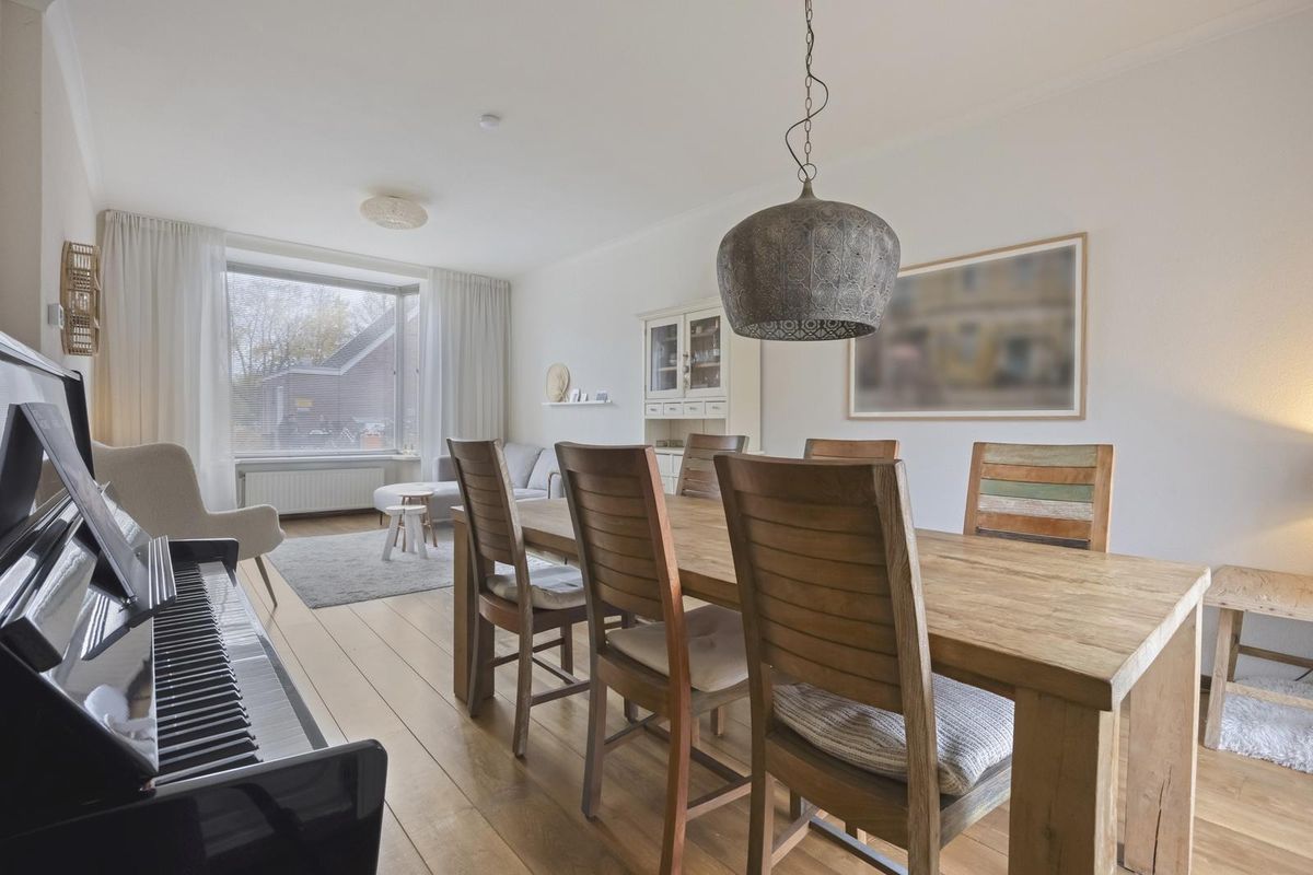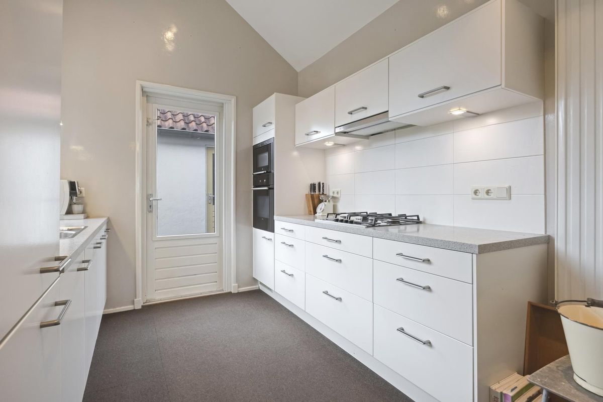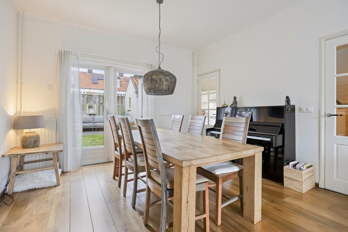 De woonkamer is echt een plaatje: een houten vloer, strakke wanden, een sfeervolle erker aan de voorzijde en volop lichtinval. De openslaande tuindeuren maken de connectie met de tuin helemaal af. De keuken bevindt zich in de uitbouw en is wit, strak en voorzien van inbouwapparatuur. Ook vanuit hier heb je direct toegang tot de tuin.