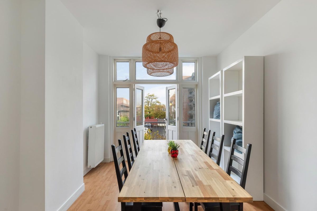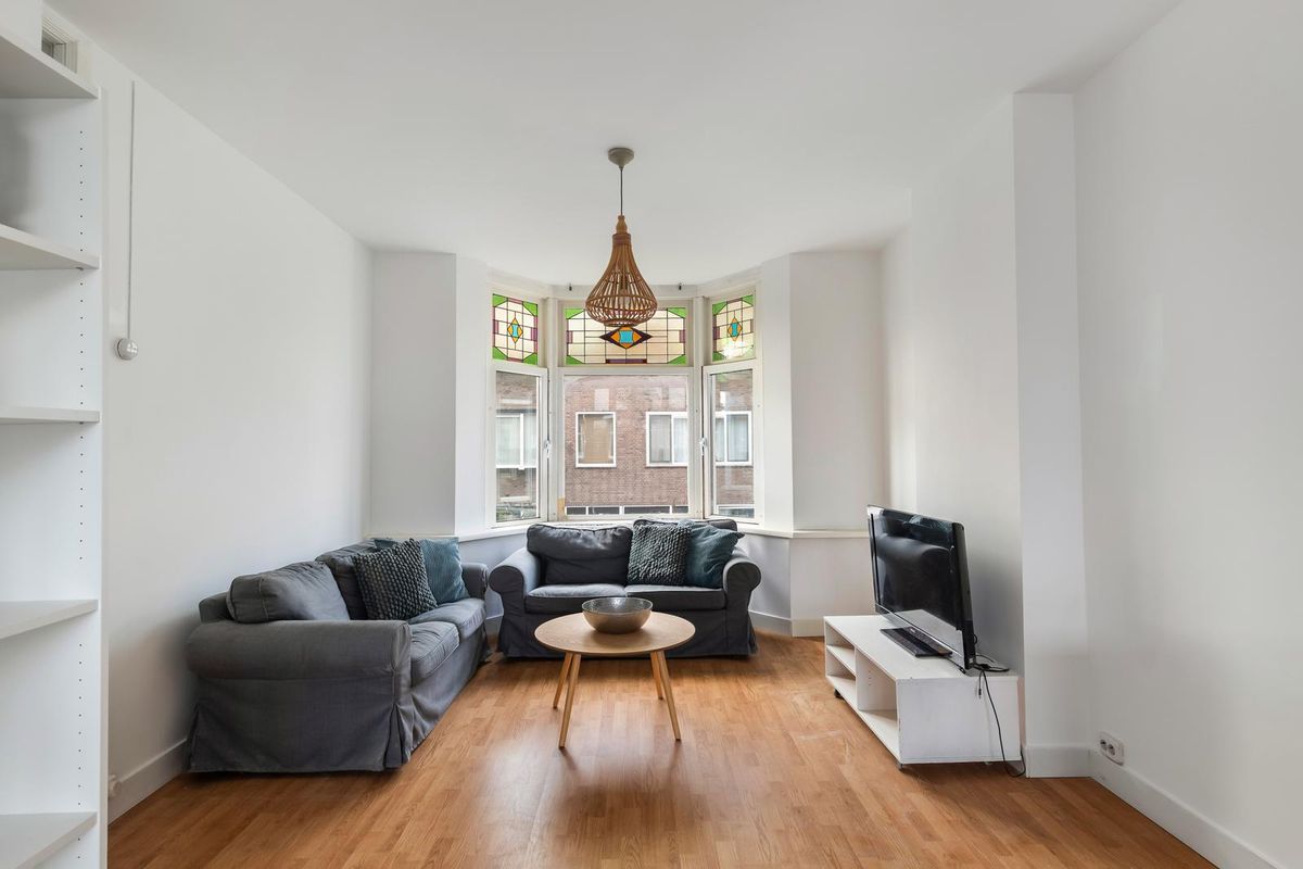 Overloop, hal toilet, doorgebroken woonkamer met erker en toegang tot het eerste balkon. Dichte keuken met nette opstelling.