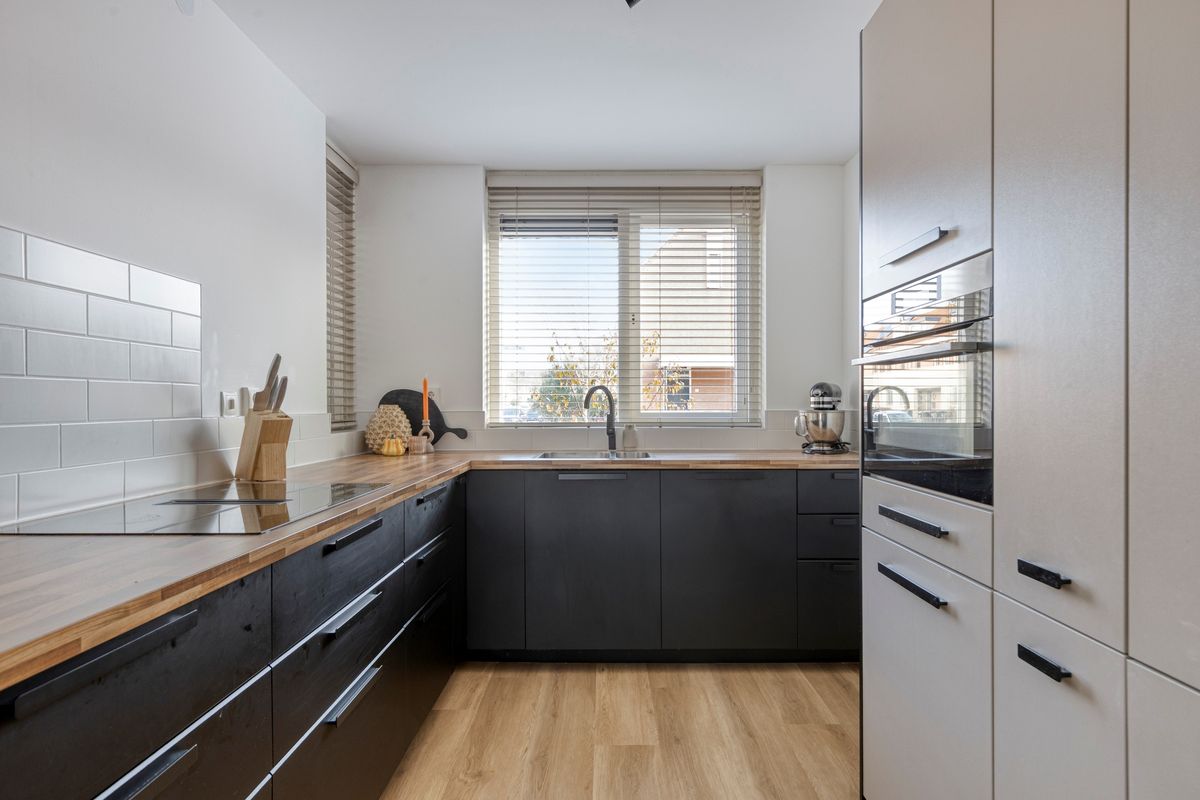 De open keuken is iets uit het zicht onttrokken doordat deze aan de voorzijde van de woning is geplaatst. Hierdoor heb je ook een mooi zicht op de straat. De moderne keuken heeft veel bergruimte en een kunststof werkblad waar lekker veel werkruimte is om de maaltijden voor te bereiden. De keuken is van alle gemakken voorzien, zoals: