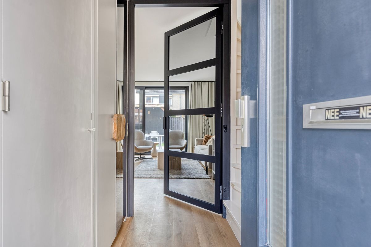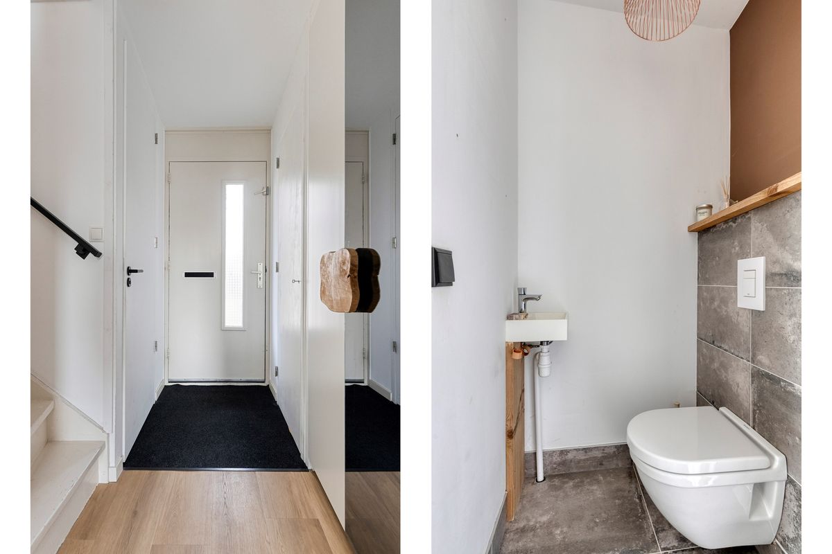 Een prettige binnenkomst van de woning in deze praktisch hal. De jassen en schoenen kunnen keurig in de ruime vaste kast worden opgeborgen. Mooi detail is de moderne glazen deur, die een kijkje in de woonkamer geeft. De hal geeft toegang tot de woonkamer, het toilet, de meterkast en trapopgang.