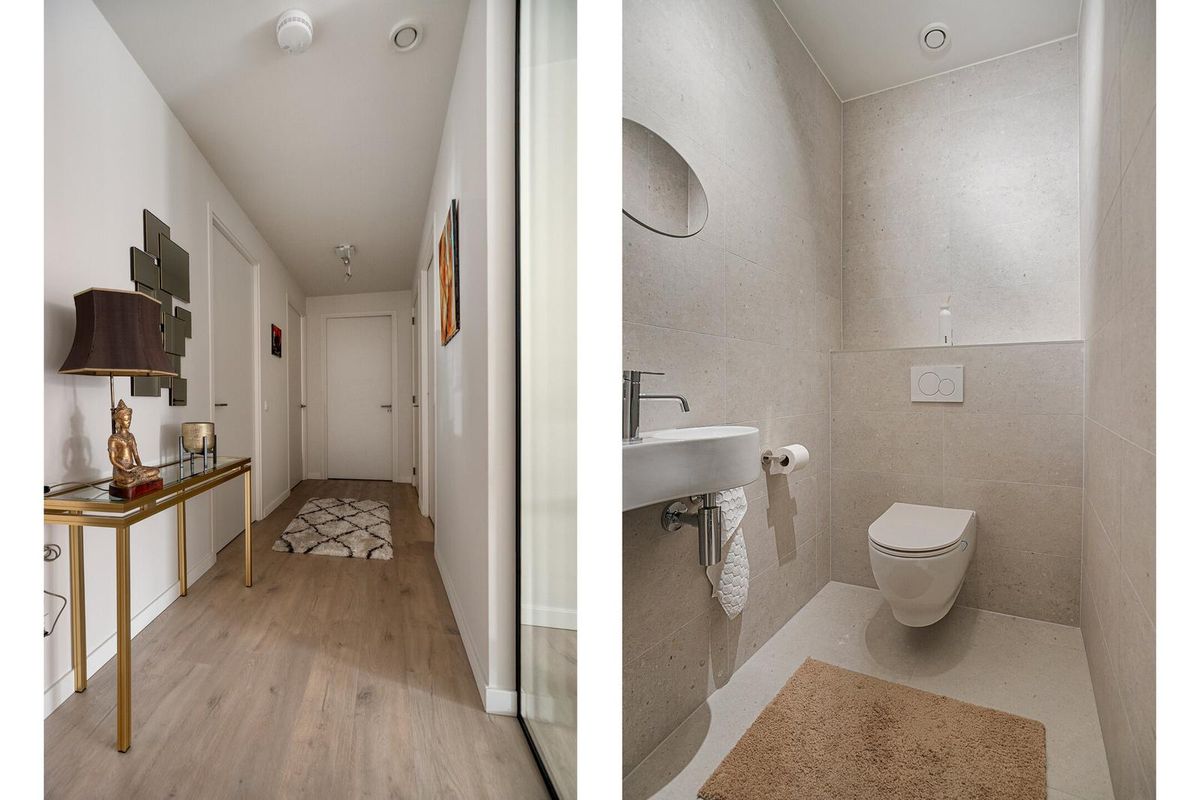 Je betreedt het appartement via de ruime hal die toegang biedt tot alle vertrekken: een apart toilet, 2 slaapkamers, een luxe badkamer en de royale, lichte woonkamer met open keuken en toegang tot het ruime balkon. Vanuit de hal is tevens de technische ruimte met warmtepomp en aansluitingen voor wasmachine en droger bereikbaar.