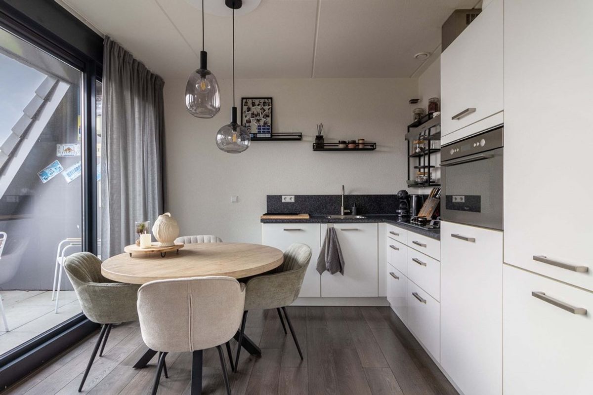 Binnen tref je een verrassend ruime woonkamer die mooi overloopt in de open keuken. Deze indeling zorgt voor een prettige en praktische leefruimte waar alles samenkomt.