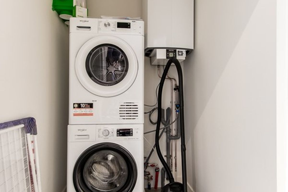 There is also a washing machine and dryer. The bathroom has a walkin shower and washbasin and toilet. At the backside of the apartment is the bedroom with a double bed and large wardrobe. There is also a desk.
