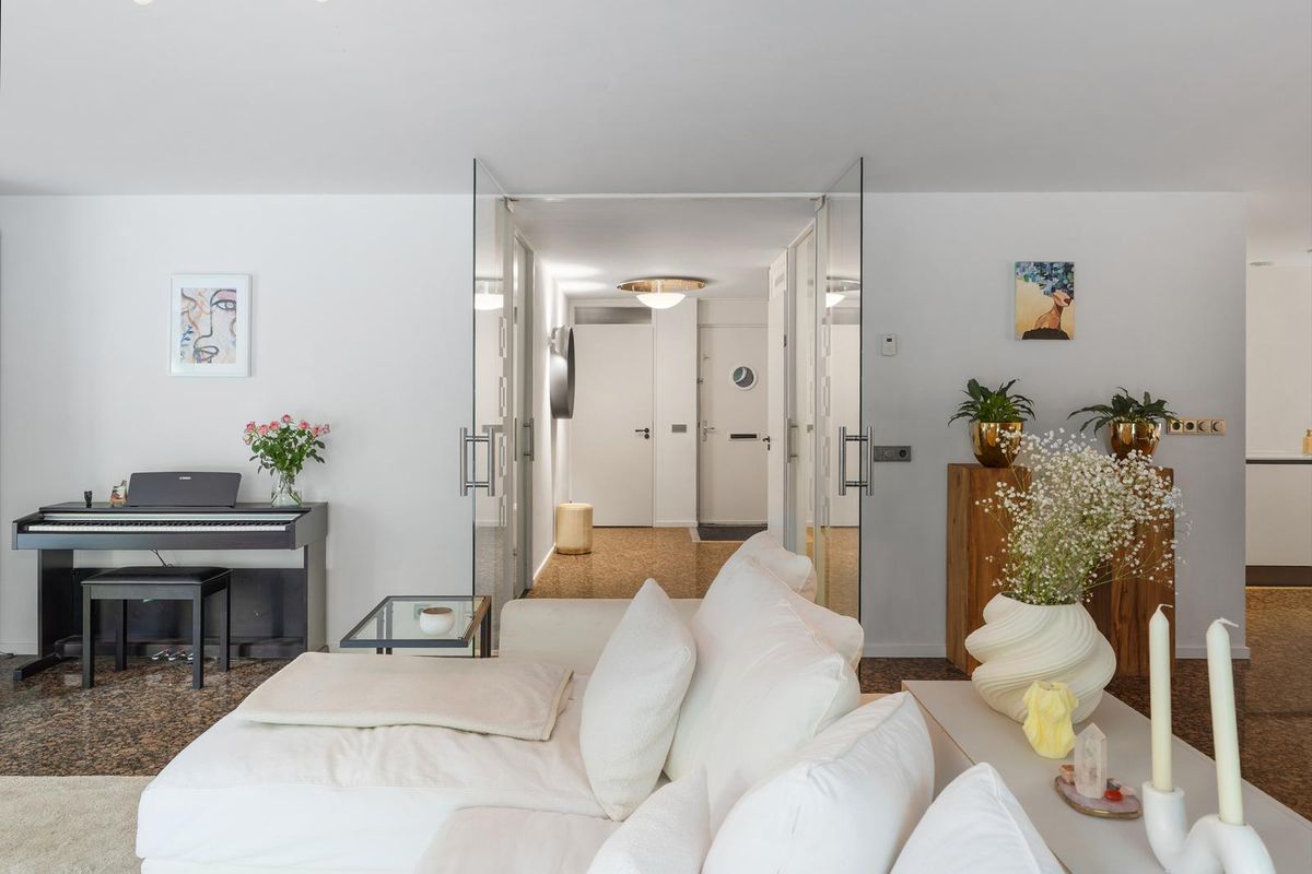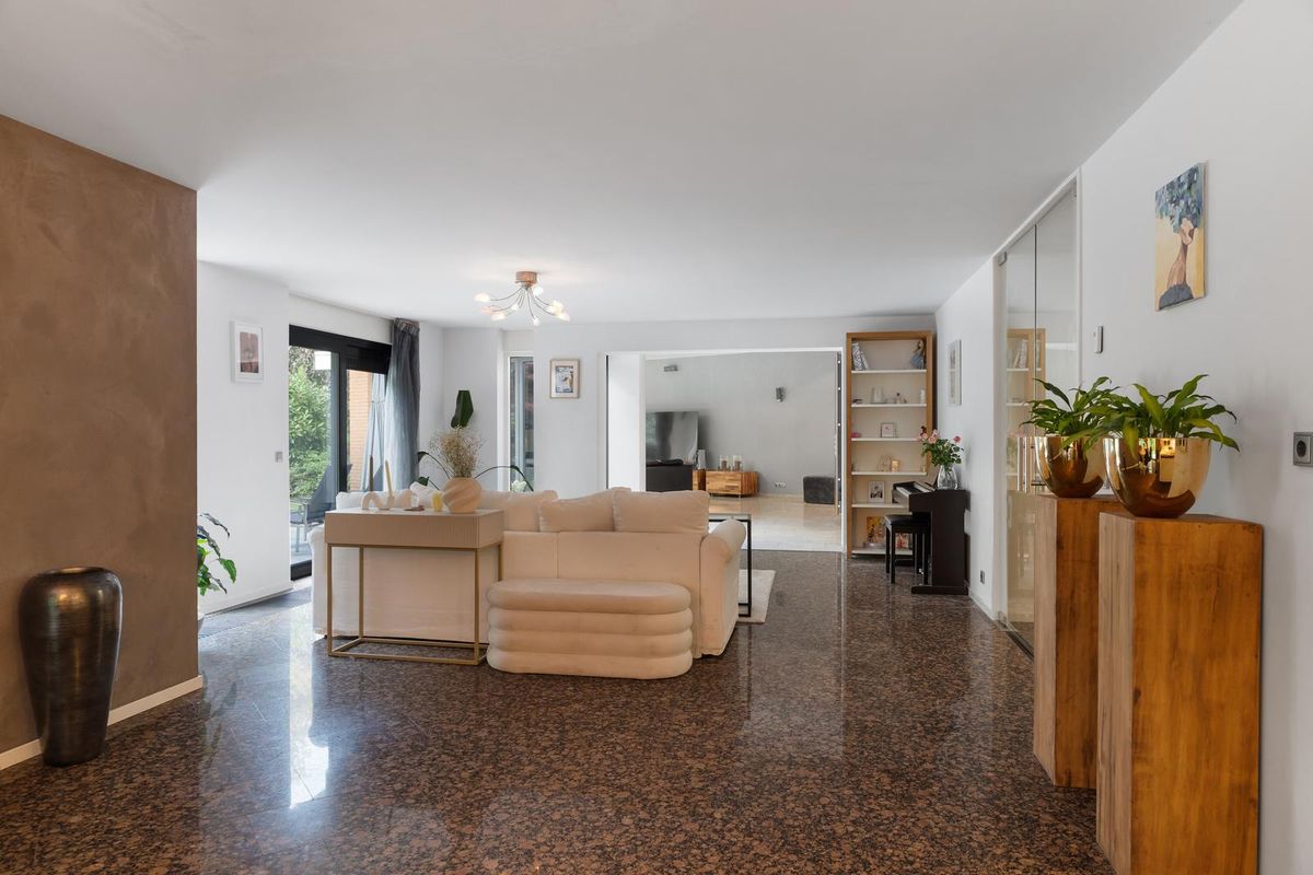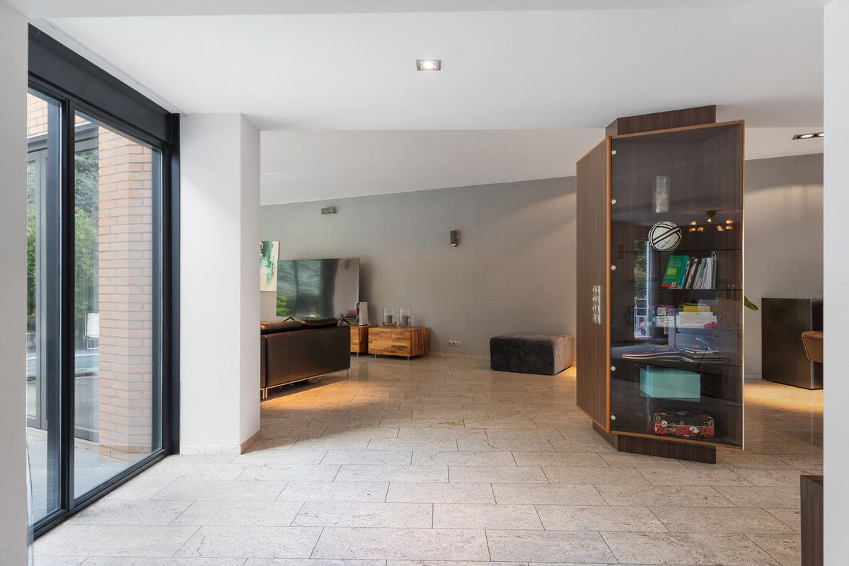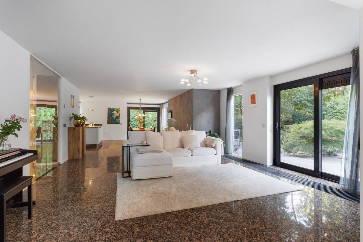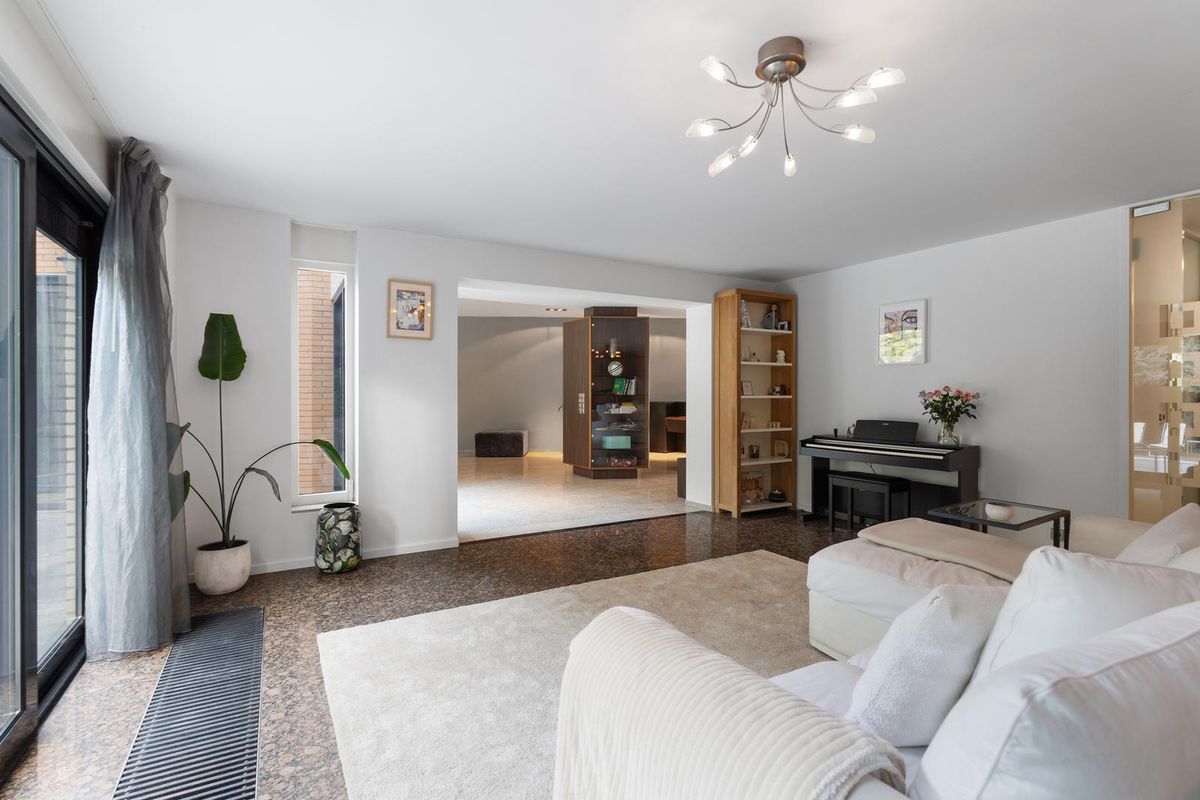 In de living staat een luxe open haard type Harrie Leenders, voor de gezellige sfeerdagen tijdens de herfst- en winter. In de muren verwerkt is een Harman Kardon 5.1. geluidssysteem met hd- geluidsboxen voor optimaal geluidweergave van uw muziek of bij het kijken van een film. Net als in de woonkeuken bevindt zich ook hier handgemaakte, greeploze opbergkasten. De vloeren zijn voorzien van twee soorten graniet Baltic Brown en een lichtere variant.