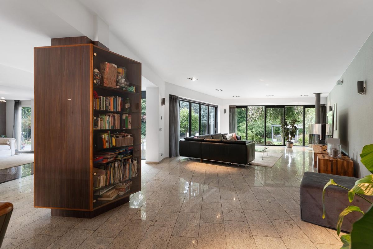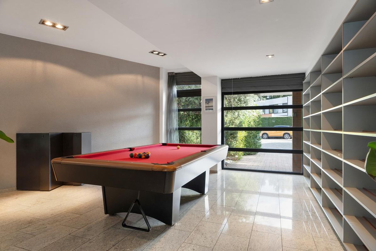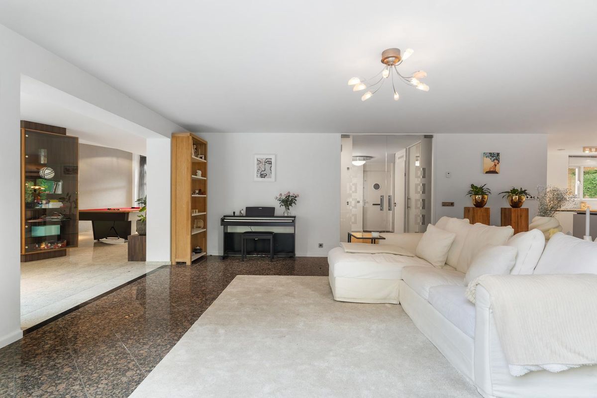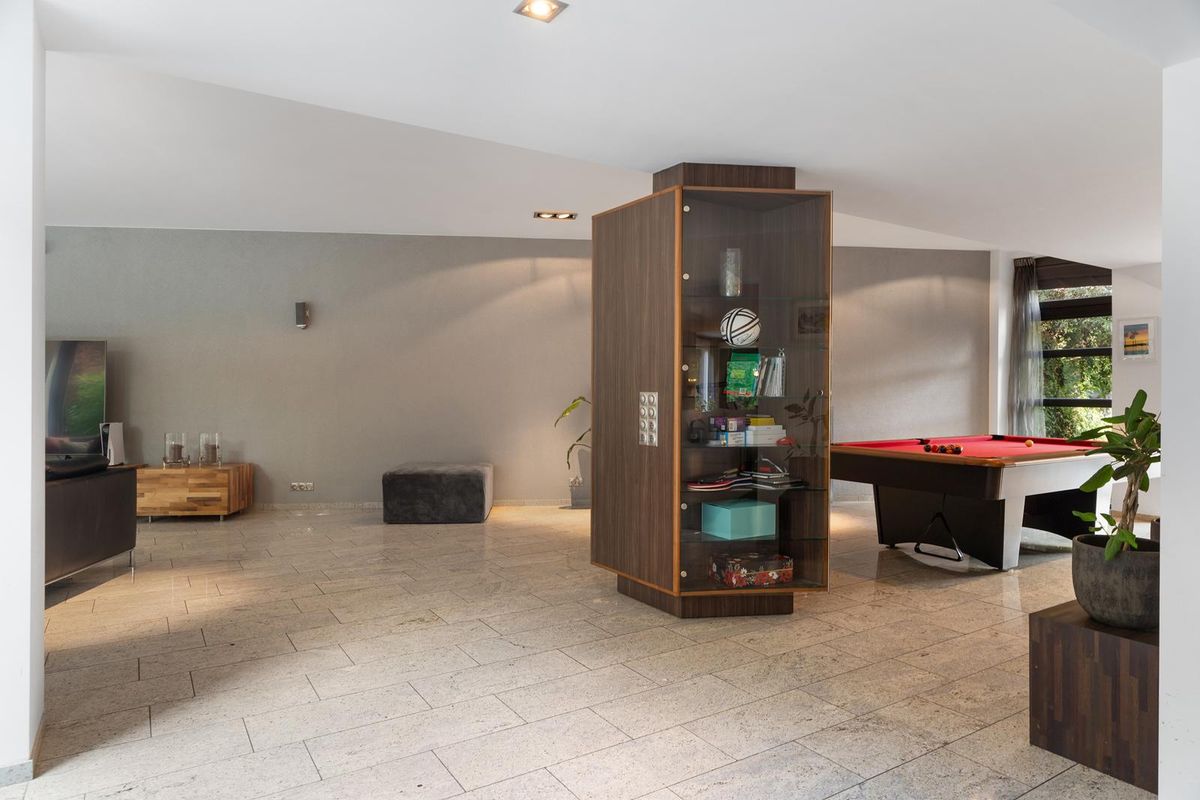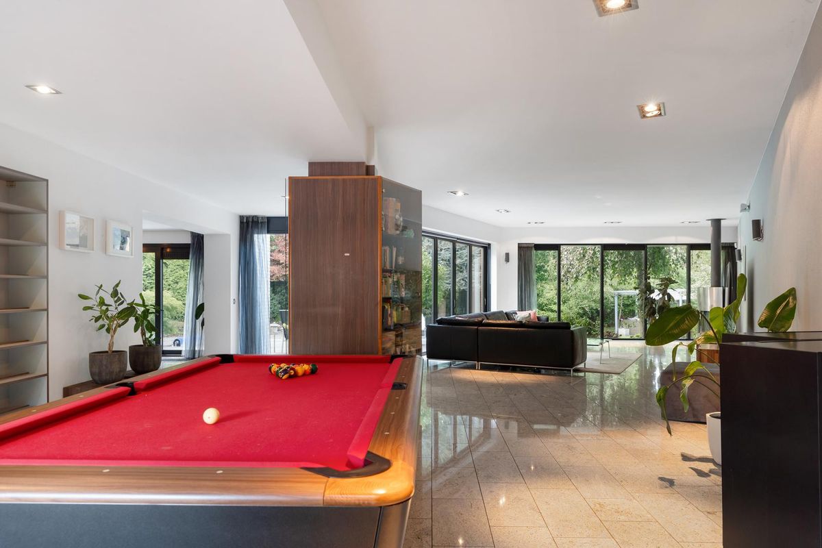 Vanuit het keukengedeelte loopt u naar het uitgebouwde middendeel van de villa. Dit geeft u toegang tot de riante living en de tuin. De woonkamer is bijzonder van architectuur en zo ontworpen dat u een optimaal zicht heeft op de tuin. Met ‘harmonica deuren’ kunt u ervoor kiezen om op mooie, warme dagen deze deuren open te zetten. In het verlengde van de living is een recreatieruimte gecreëerd waar nu een 8-foot pooltafel staat opgesteld.