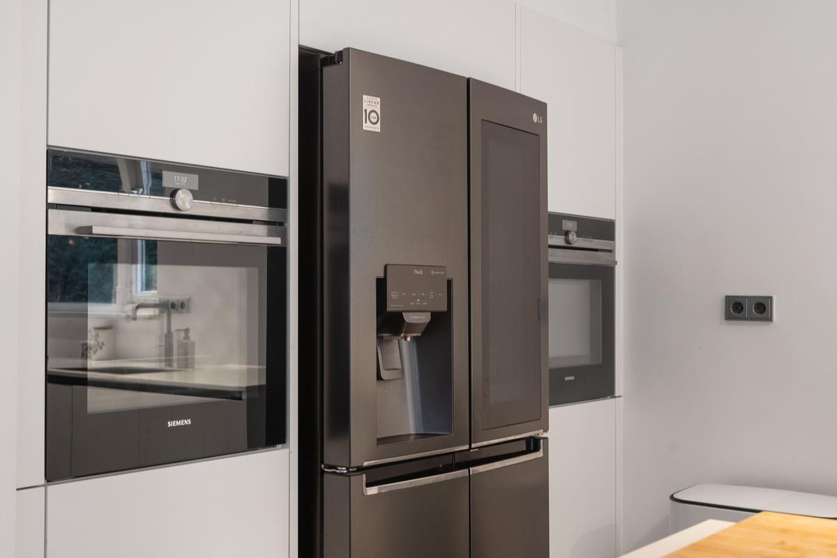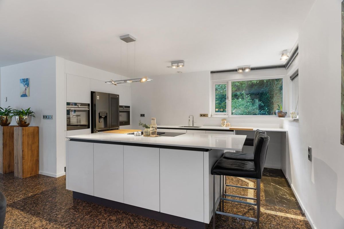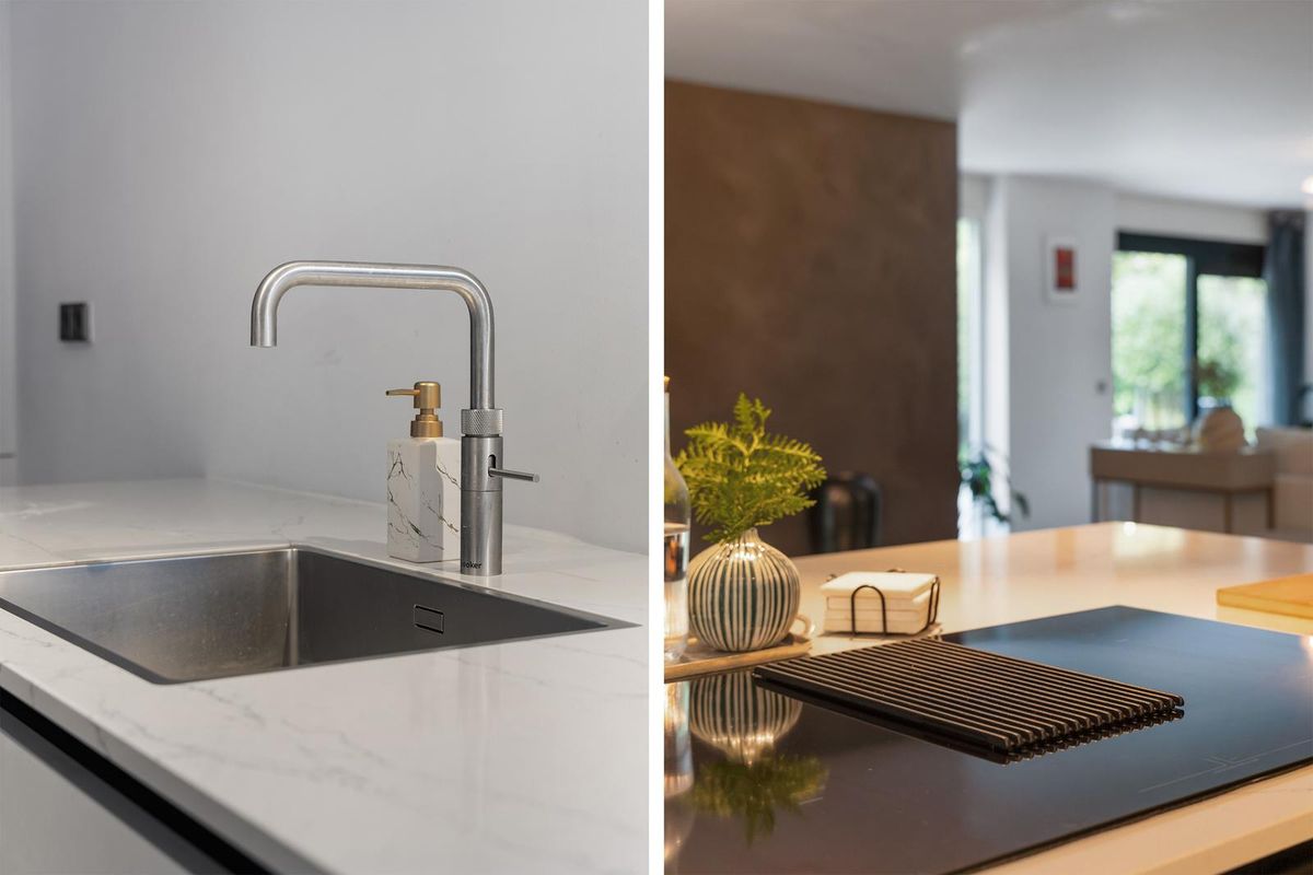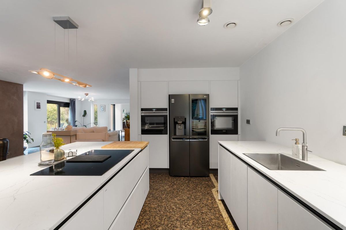 Aan de linkerzijde bevindt zich de grote L-vormige woonkeuken (2022) met een kookeiland. De keuken is voorzien van inbouwapparatuur: een vaatwasser, een koelkast, een oven/magnetron, een inductiekookplaat (3 fasen) met een afzuigkap. Het werkblad van de keuken is van marmer.