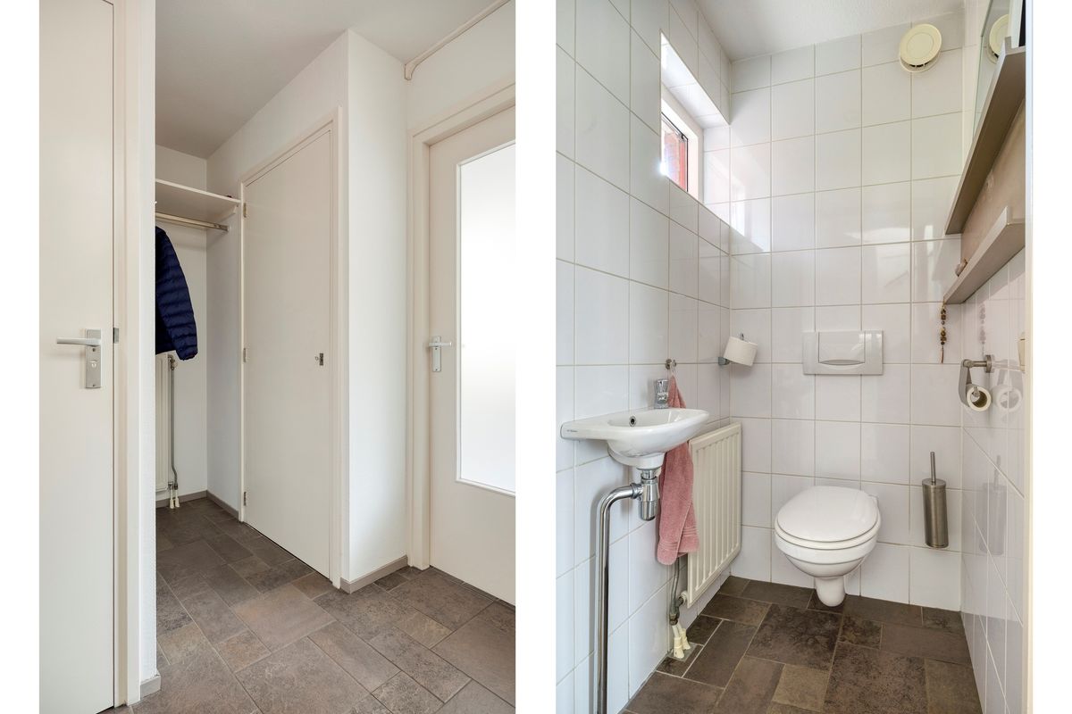 Je komt binnen in een ruime hal met een keramische tegelvloer die doorloopt in de woonkamer en keuken. De hal is licht en overzichtelijk. Hier bevinden zich de meterkast en een toilet met wastafeltje en klepraampje. Via een deur met matglas stap je de woonkamer in.