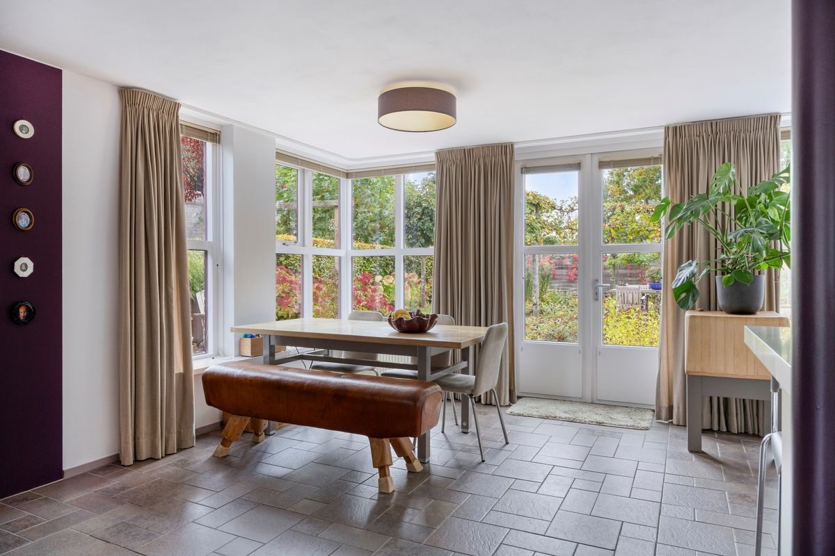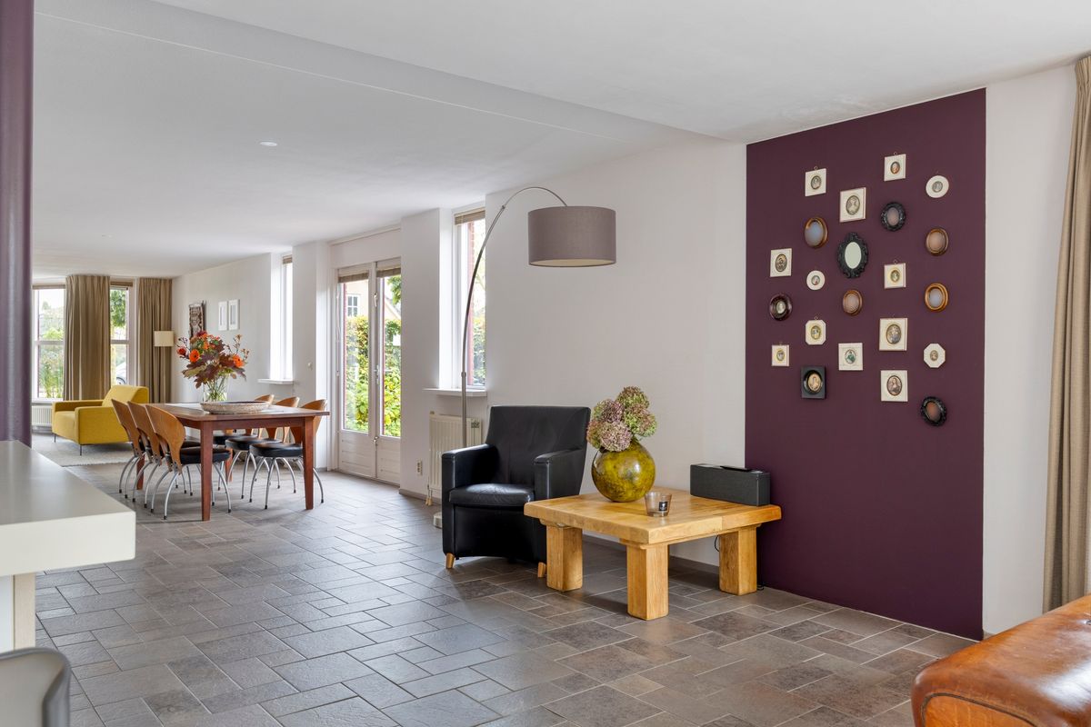 De woonkamer is indrukwekkend groot en voelt direct warm aan. Aan de voorkant van het huis zorgt een erker voor veel lichtinval en geeft deze de woning een bijzondere, vriendelijke uitstraling. Aan de achterzijde geven openslaande tuindeuren toegang tot de tuin. Midden in de woonkamer, richting de zijtuin, zijn nog extra openslaande deuren die zorgen voor nog meer licht en direct contact met buiten. Er is ruimte voor een royale zithoek, een grote eettafel én eventueel een werkhoek. Onder de trap is een handige proviandkast, netjes afgesloten met een deur. De woonkamer is voorzien van vloerverwarming, wat zorgt voor een comfortabel en behaaglijk woonklimaat.