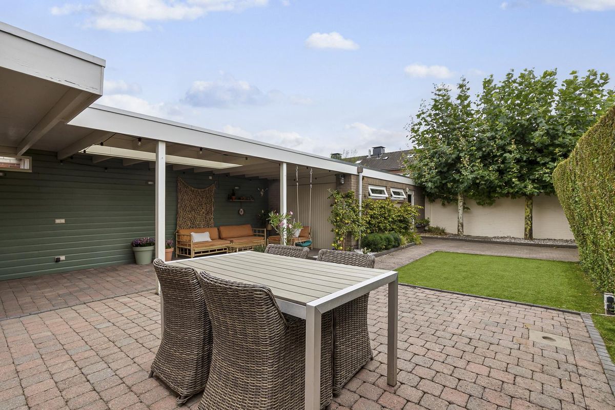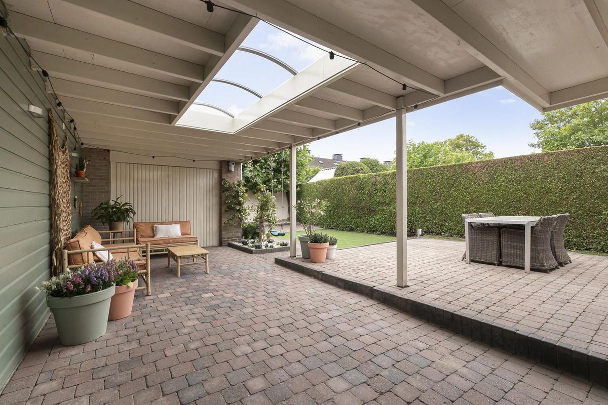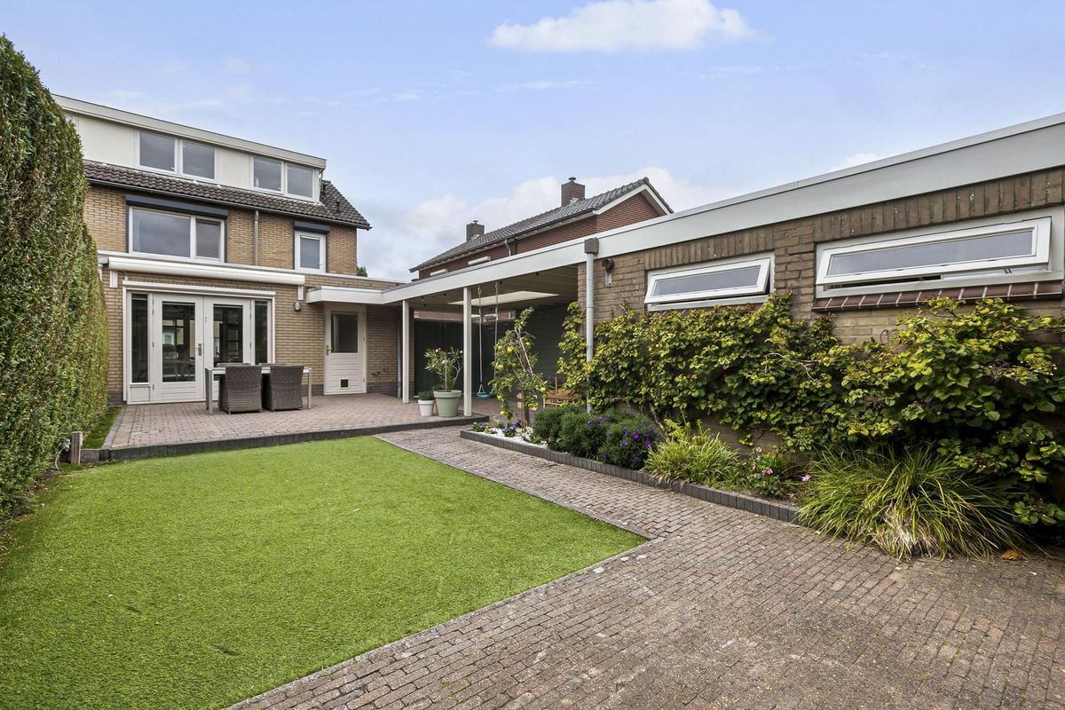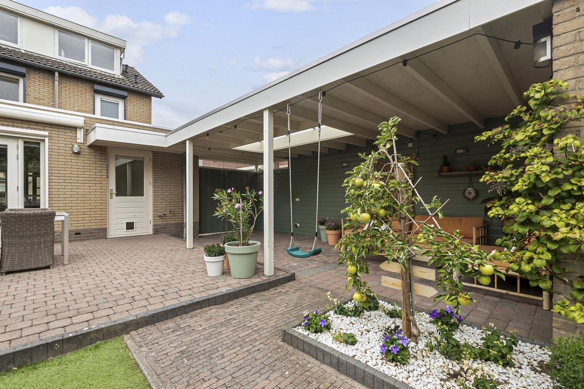 De achtertuin is verzorgd aangelegd met een ruim terras, groen kunstgras en volwassen beplanting. Een ruime garage met overkapping fungeert als extra zitgedeelte en biedt volop mogelijkheden voor opslag of hobby’s. Tevens is er een zonnescherm aanwezig. Via een poort is de oprit bereikbaar, waar plek is voor meerdere auto’s. De garage beschikt over elektra, verlichting, een kleine werkbank en twee praktische inbouwkasten. Achterin de tuin zorgen twee bomen voor beschutting en privacy. De voortuin is fraai en onderhoudsvriendelijk aangelegd met stapstenen, grind, een groene border en diverse beplanting.