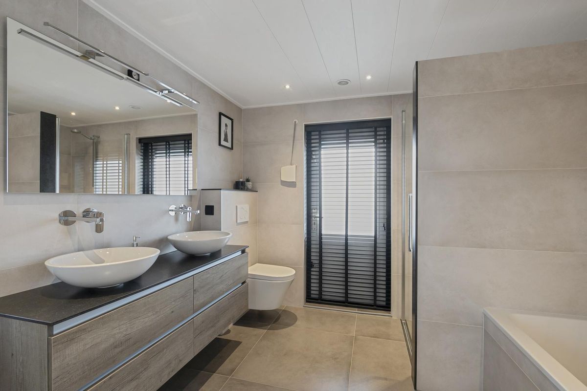 Op de eerste verdieping geeft de overloop toegang tot drie slaapkamers en een complete badkamer. Aan de achterzijde bevindt zich een ruime kamer met laminaatvloer en raampartij. De master bedroom aan de voorzijde is voorzien van een vast en een draai-/kiepraam, alle ramen beschikken over rolluiken. De badkamer is ingericht met een ligbad, douche met nis, dubbele wastafel, toilet en een spiegel met verlichting. Een groot raam op de overloop zorgt voor aangenaam daglicht. De afwerking is modern en neutraal, met bruine tegels als accent.
