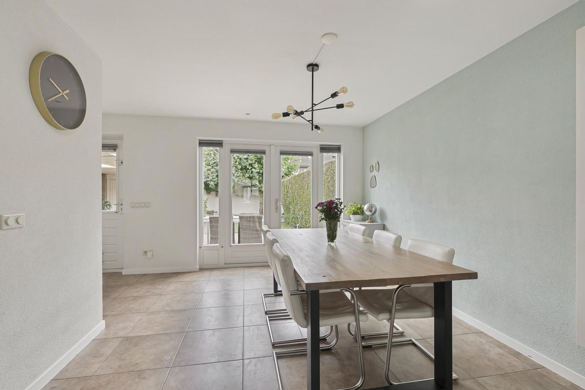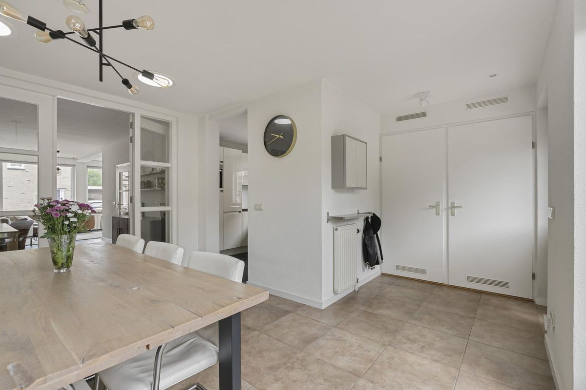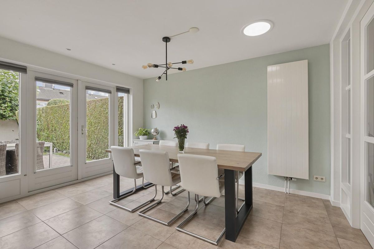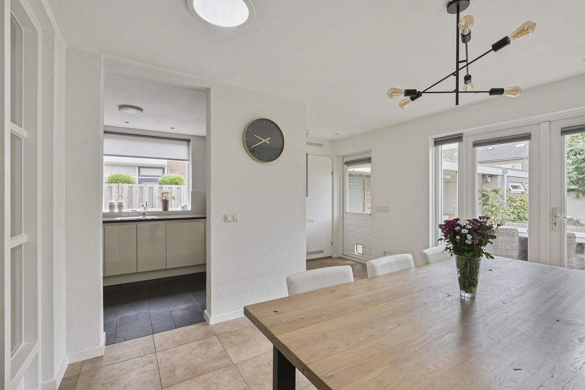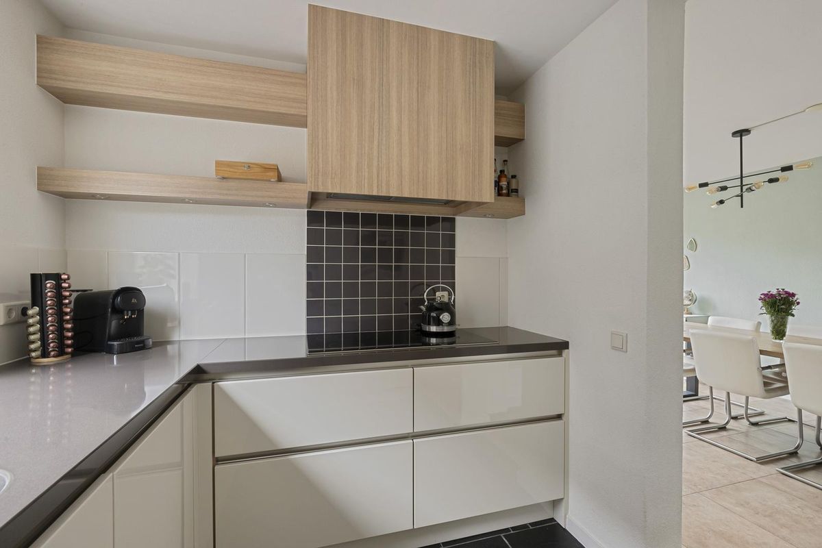 Begane grond: de royale begane grond wordt gekenmerkt door een nette afwerking en praktische indeling. In de woonkamer ligt een zwarte tegelvloer met vloerverwarming, wat zorgt voor een strak en comfortabel geheel. Middels een doorloop bereikt men het eetgedeelte. De aangrenzende keuken is ingericht in een U-opstelling met crèmekleurige hoogglansfronten en een donkerbruin werkblad. Daarnaast uitgerust met hoogwaardige inbouwapparatuur, waaronder een vijf-pits kookplaat met midden brander, combi-oven, magnetron, vaatwasser, koelkast en afzuigkap. Inbouwspots zorgen voor sfeervolle verlichting en er is volop werk- en bergruimte aanwezig. Achter de keuken bevinden zich nog twee diepe kasten, perfect voor extra opslag en het plaatsen van wasmachine en vriezer. Twee openslaande deuren verbinden de binnenruimte met de tuin.