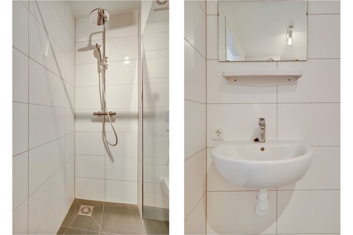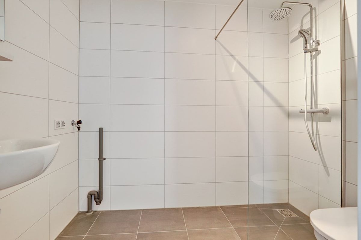 De badkamer ziet er prachtig uit, is helemaal betegeld en is voorzien van een inloopdouche, een vrijhangend closet, een wastafel en de wasmachine-aansluiting.