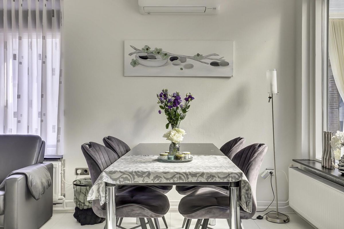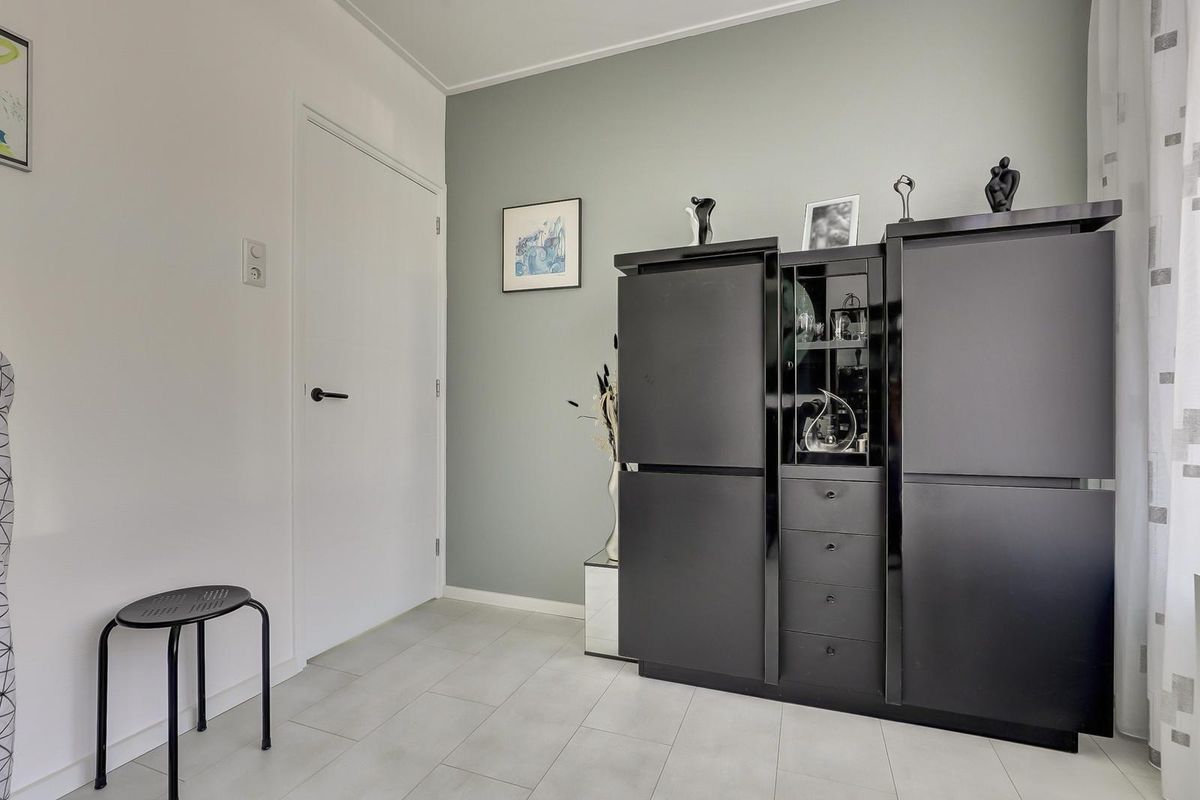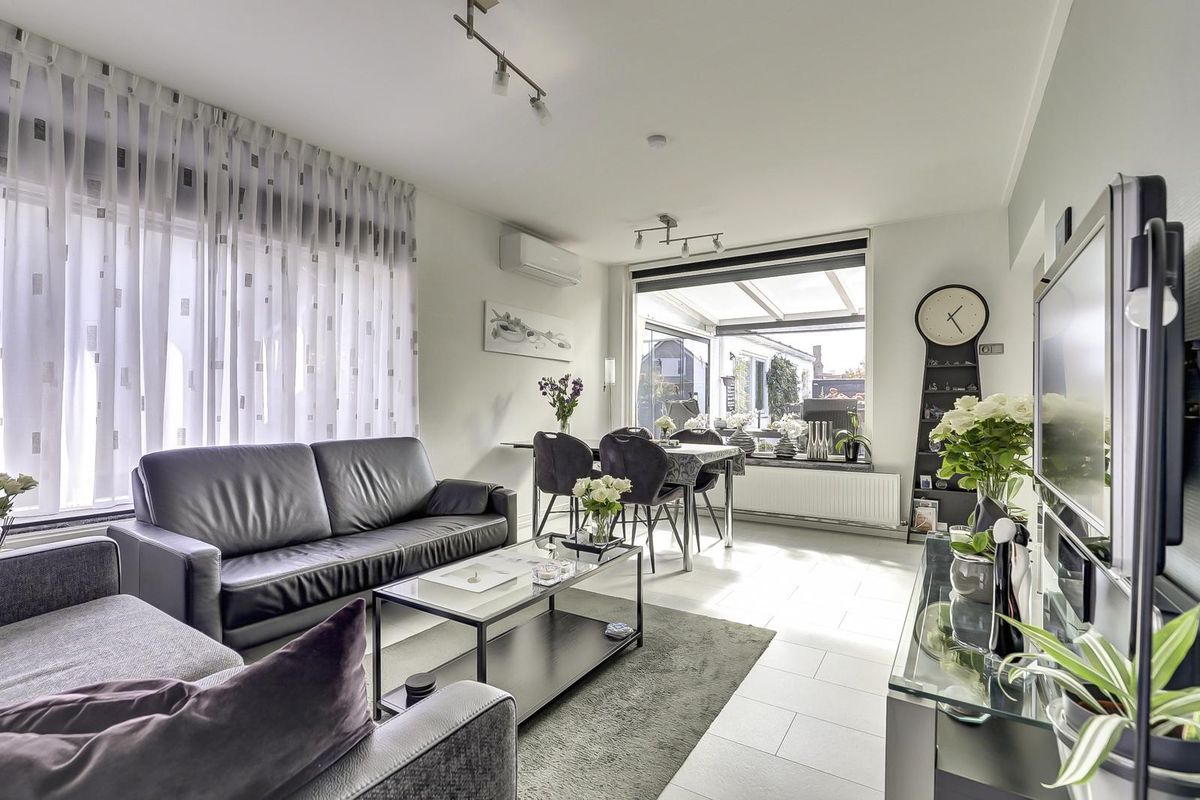 De entree bevindt zich aan de zijkant van de woning en leidt naar een centrale hal met toegang tot alle vertrekken. De woonkamer is opvallend licht door de grote ramen en heeft een strakke vloer in neutrale tinten. Aan de achterzijde is een serre met overkapping aangebouwd, waardoor binnen en buiten mooi in elkaar overlopen.