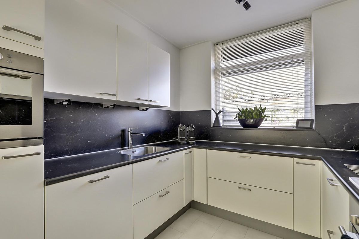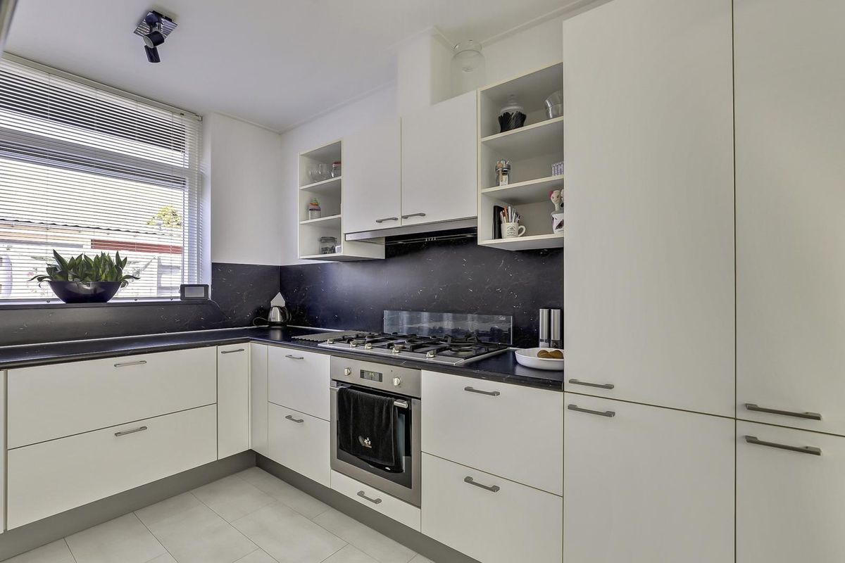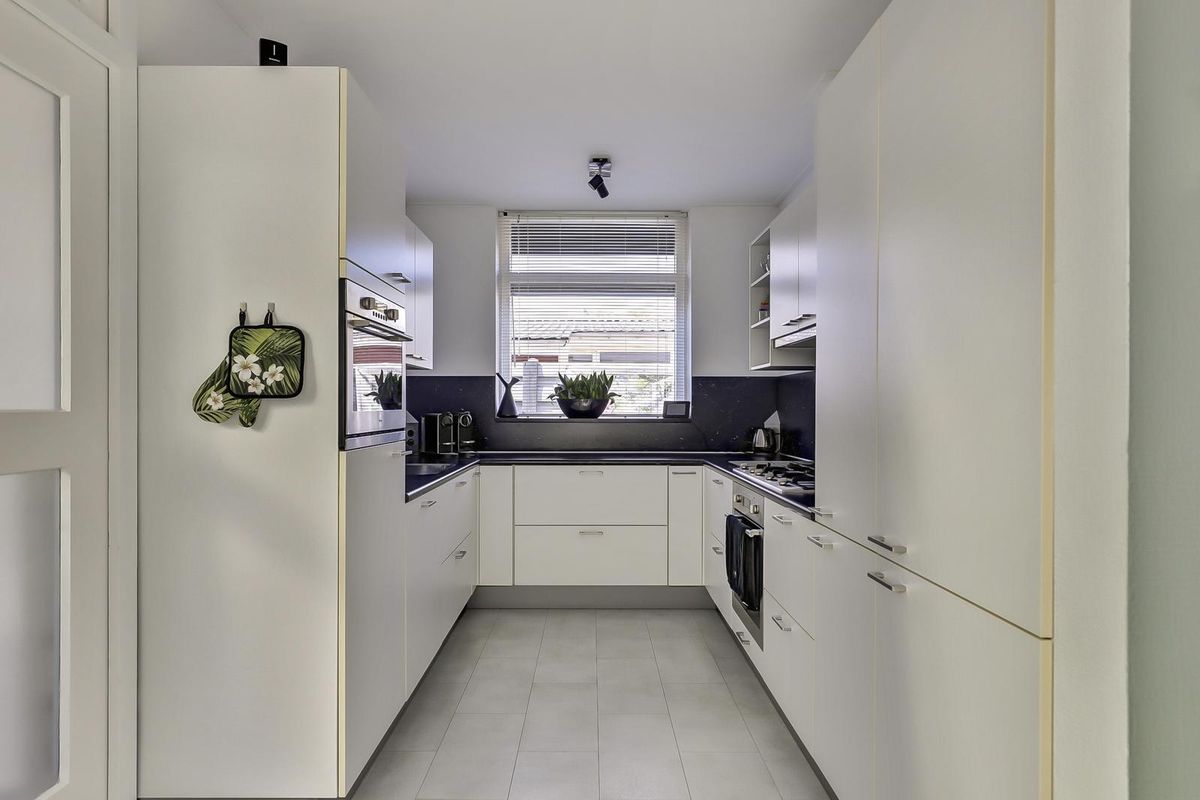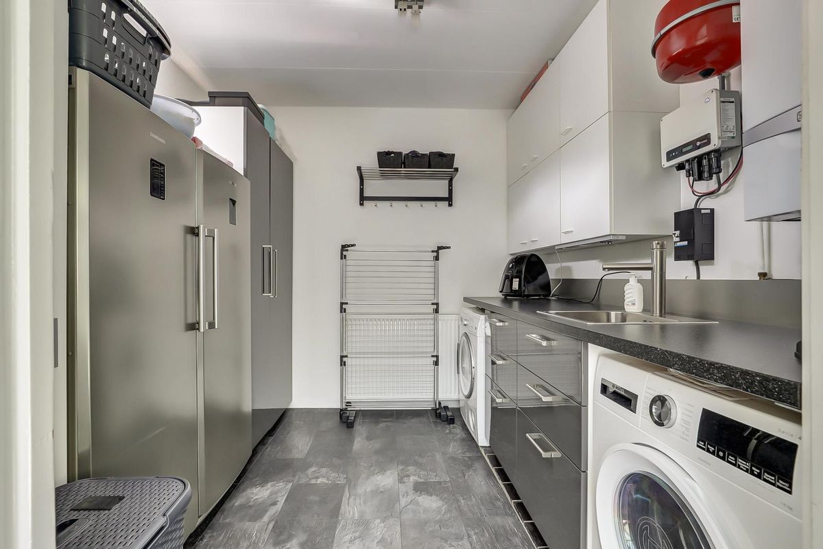 De keuken heeft een praktische U-opstelling met veel werk- en kastruimte. De lichte kasten en het donkere werkblad geven een moderne uitstraling. De keuken is voorzien van diverse inbouwapparatuur, waaronder een oven, gasfornuis, afzuigkap, koelkast, vriezer en vaatwasser. Aangrenzend ligt de bijkeuken met aansluitingen voor wasmachine en droger. Onder de bijkeuken bevindt zich een bergruimte die bereikbaar is via een groot luik