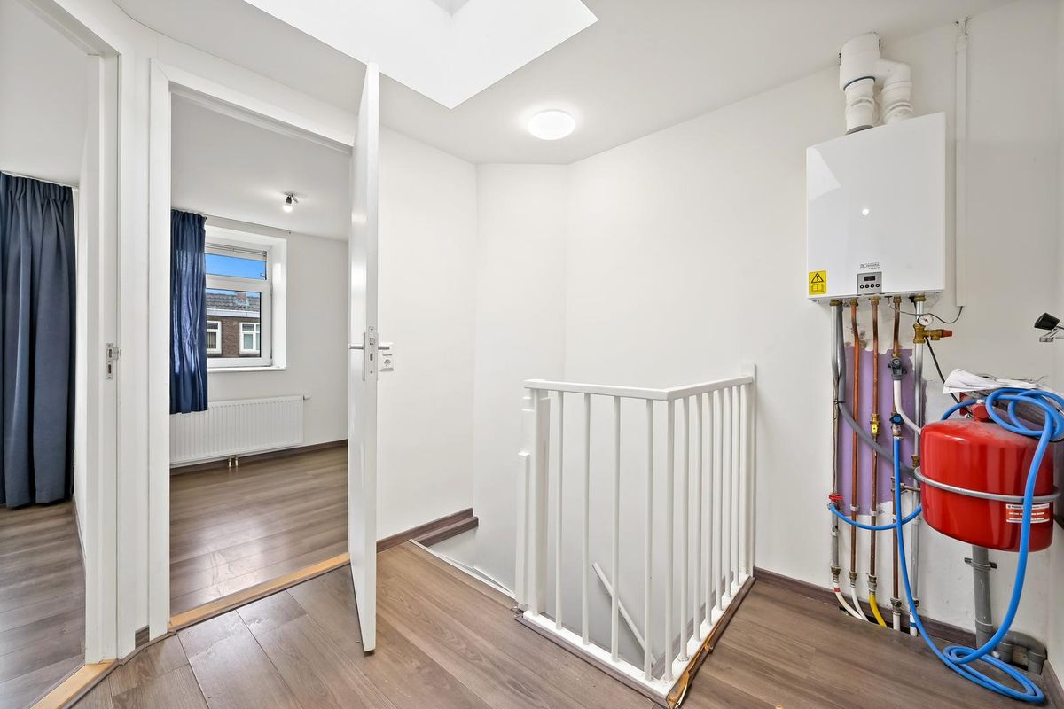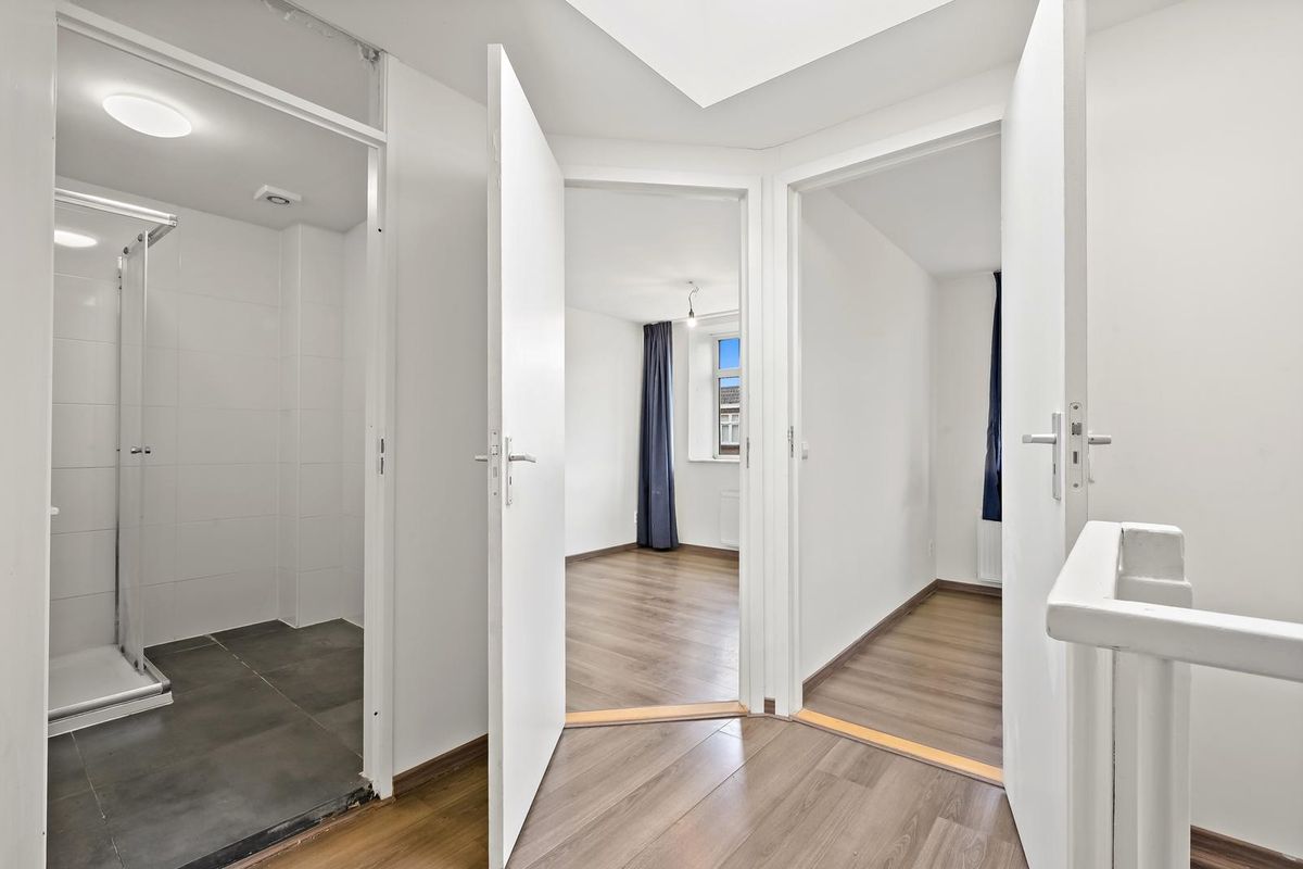 Ruime overloop met cv opstelling en wasmachine aansluiting, slaapkamer II en III en moderne badkamer voorzien van douche en wastafel.
