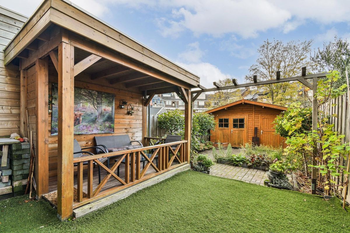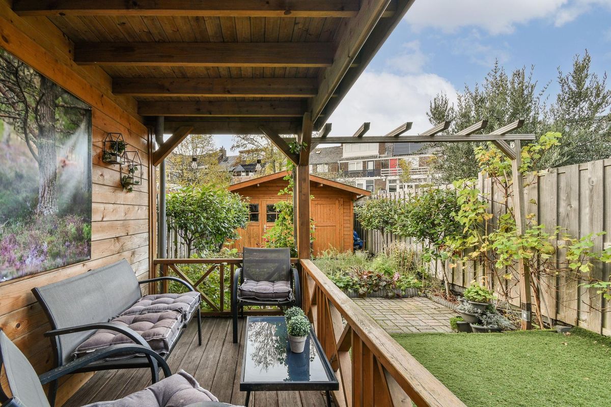 Vanuit de keuken is er toegang tot de achtertuin. De tuin is werkelijk een plaatje. Met een kunstgazon, een sfeervolle houten veranda met houten vlonders, een stenen terras en divers groen is er voor ieder wat wils. Achterin bevindt zich een grote houten berging die in tweeën verdeeld is, ideaal voor fietsen en opslag.