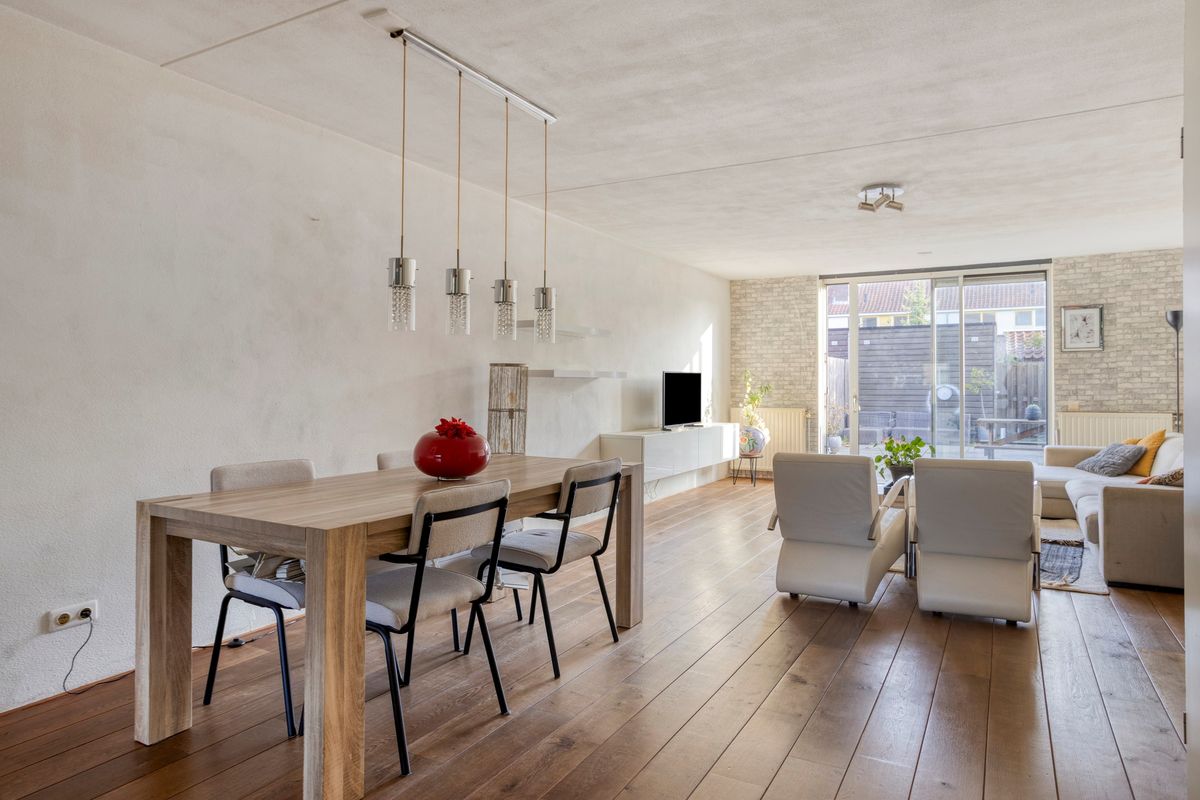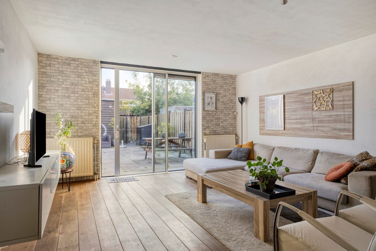 De uitgebouwde woonkamer beschikt over een houten vloer en een schuifpui die uitzicht biedt op de tuin. Dankzij de uitbouw van 2,5 meter is er een ruime leefruimte ontstaan, met veel lichtinval en een prettige indeling.