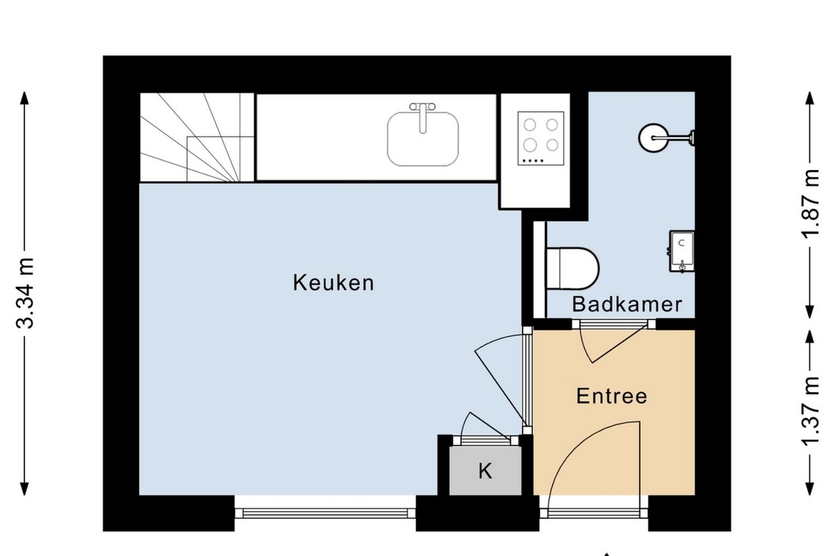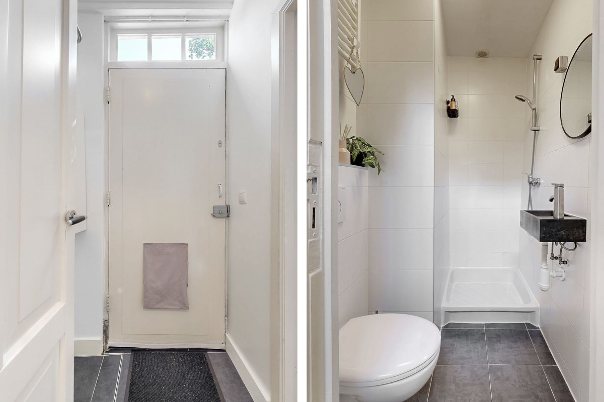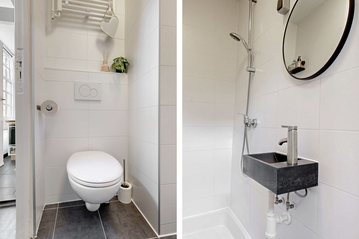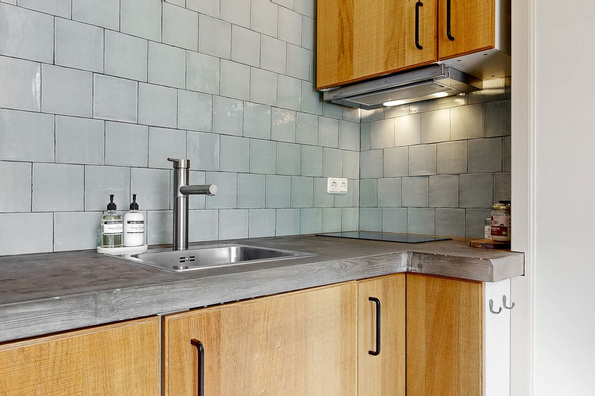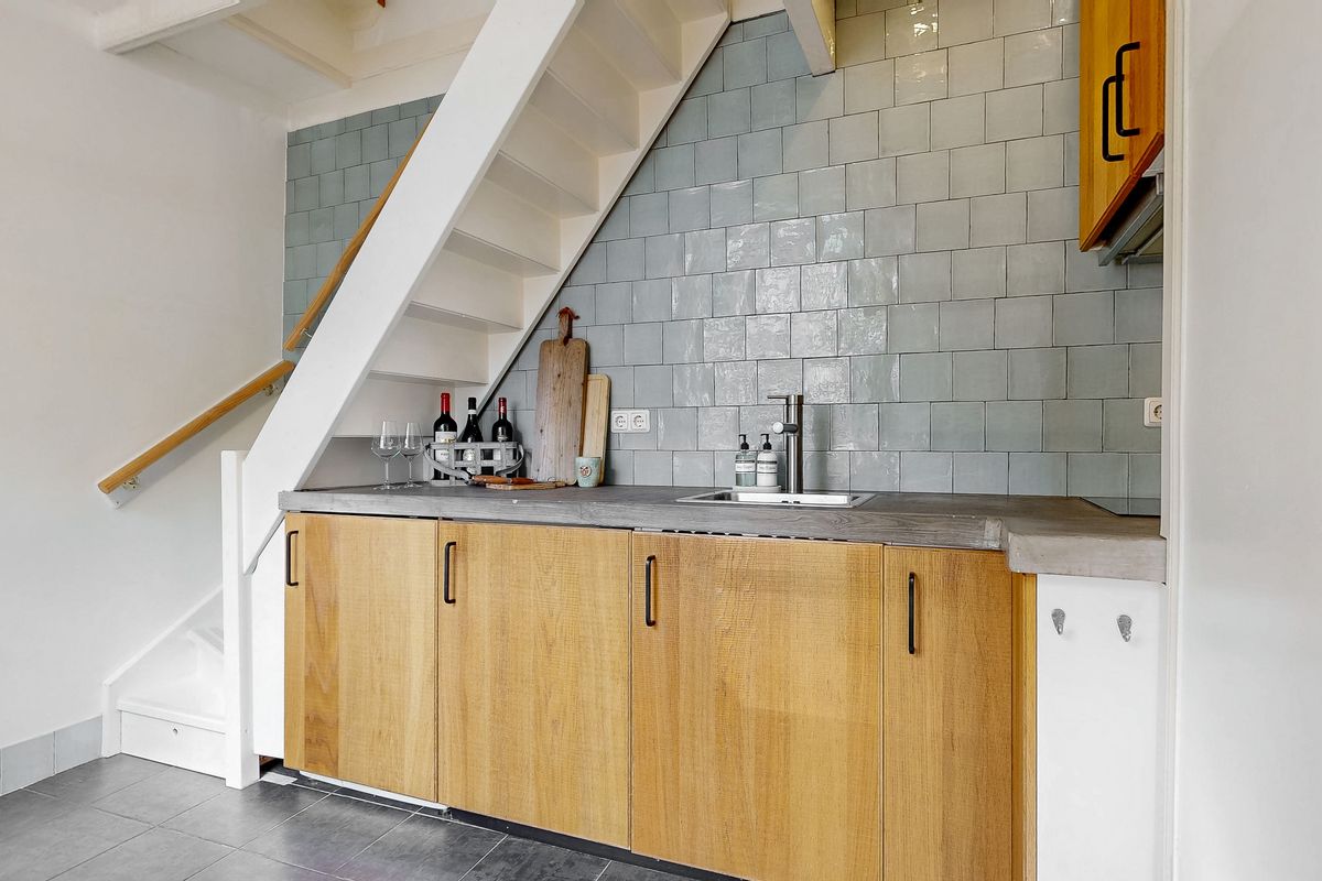 Via de entree kom je binnen in de gezellige woonkeuken. Hier tref je een luxe keuken met massief houten deurtjes en een robuust betonnen werkblad. Een vaste, betegelde bank rondom de radiator maakt het plaatje compleet: een knusse plek om te zitten en te genieten van het uitzicht naar buiten. De badkamer is eenvoudig maar modern uitgevoerd, praktisch en fris.