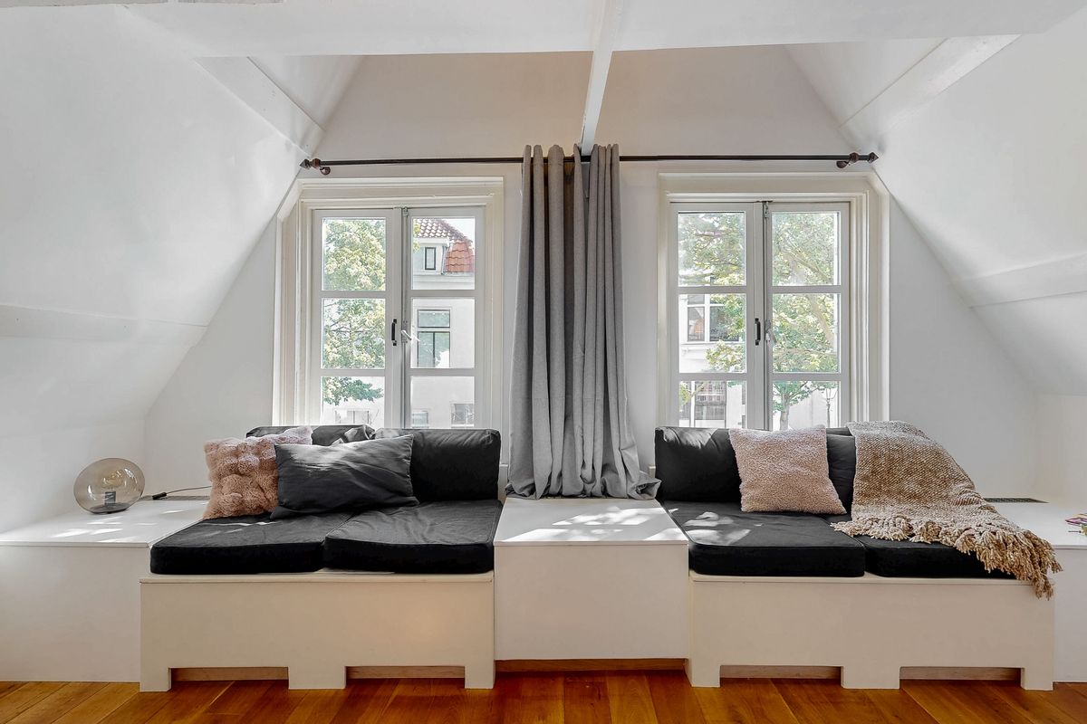 Op de eerste etage bevindt zich de lichte woonkamer. Dankzij de twee dubbele ramen met isolatieglas geniet je hier van veel daglicht en een prettig uitzicht op de gracht. De sfeer is warm en uitnodigend – een heerlijke plek om tot rust te komen.