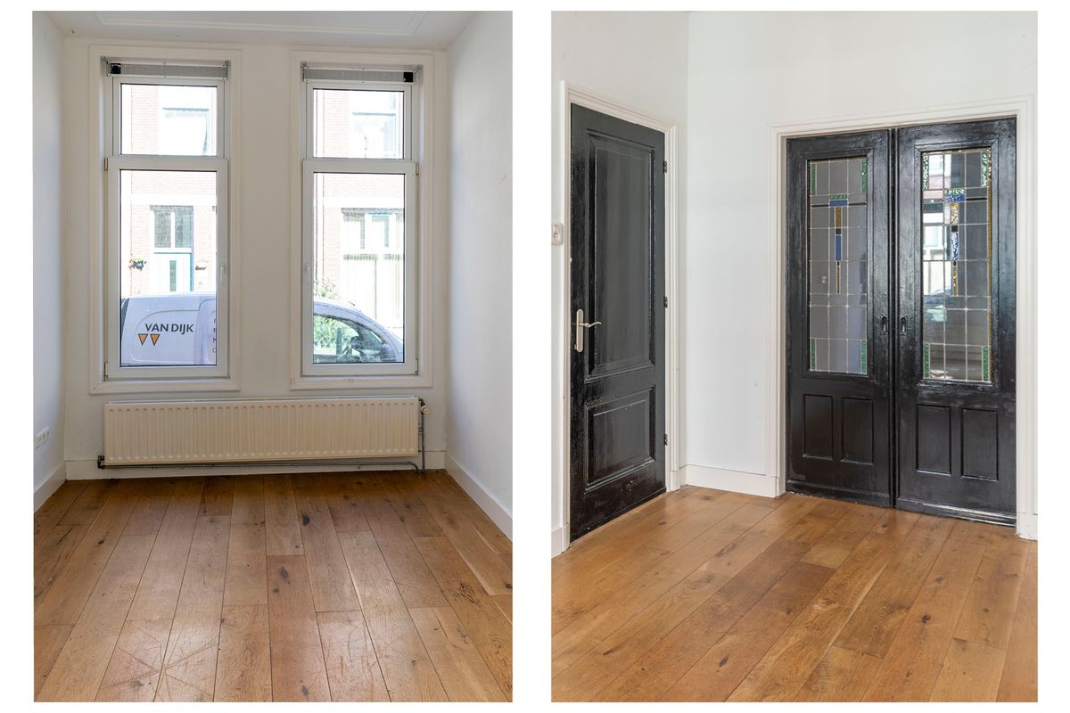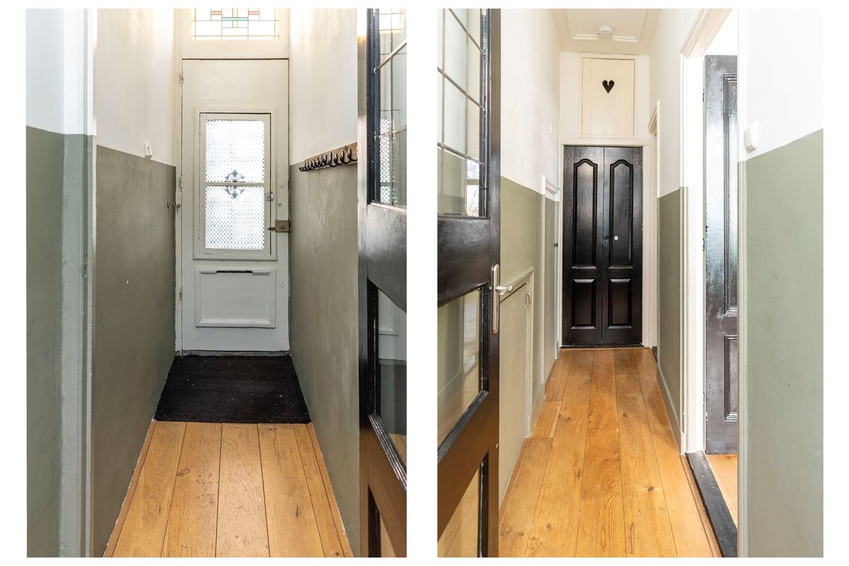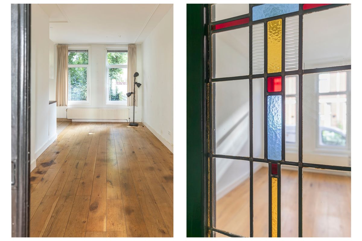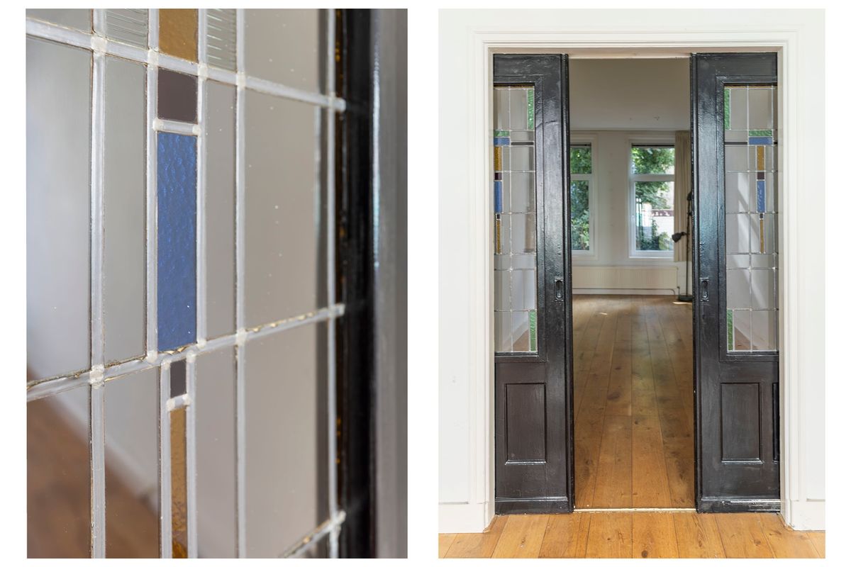 Vanuit de woonkamer is een en suite naar de slaapkamer toe aan de voorzijde met nog authentieke schuifdeuren met glas-in-lood. Zowel voor- als achterzijde zijn er kunststof kozijnen met dubbele beglazing.