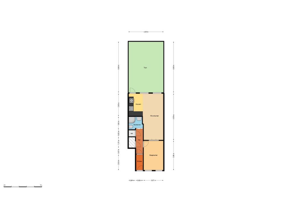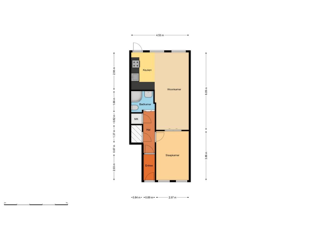 Via de eigen voordeur op de begane grond is er toegang tot de hal die toegang biedt tot de meterkast, badkamer, kastruimte en slaapkamer.