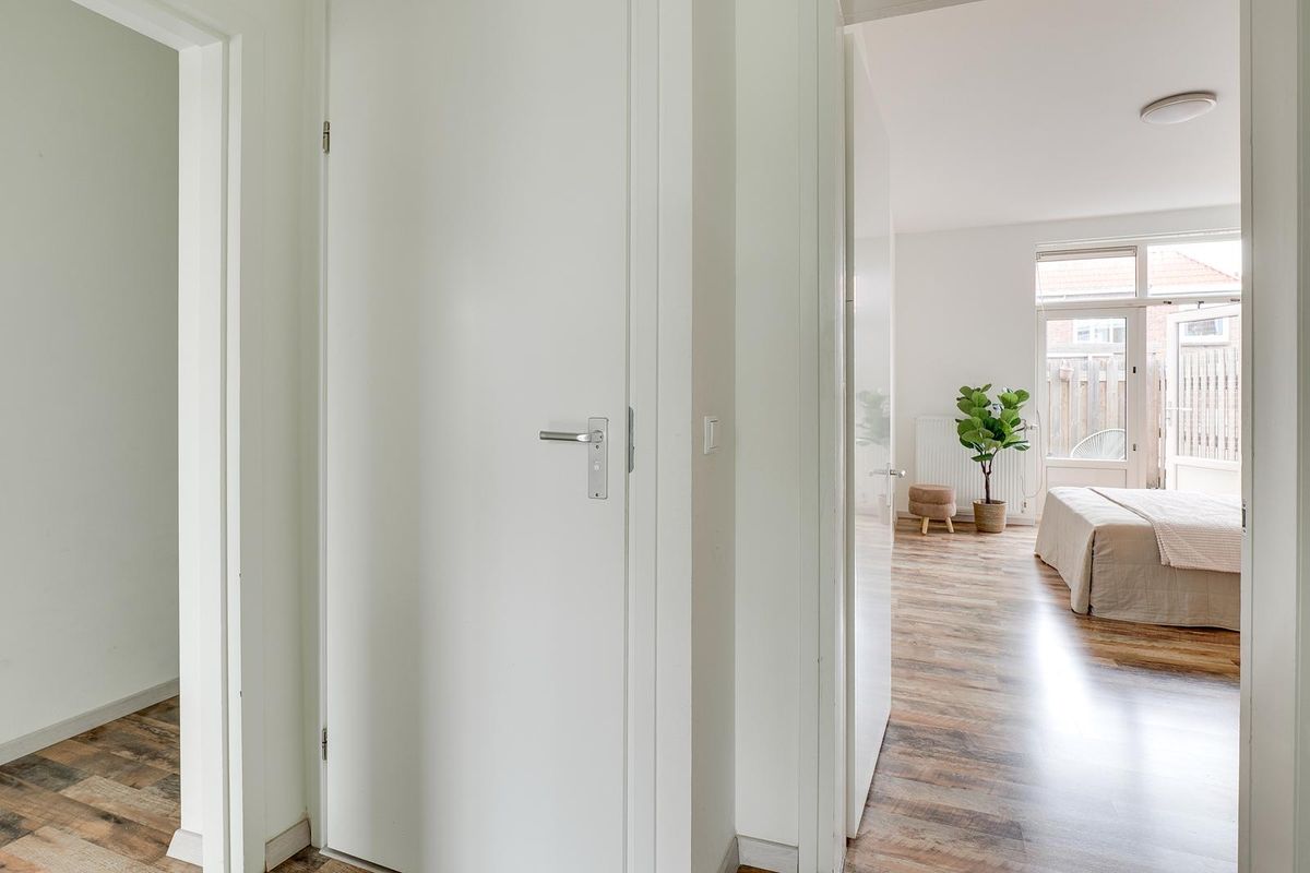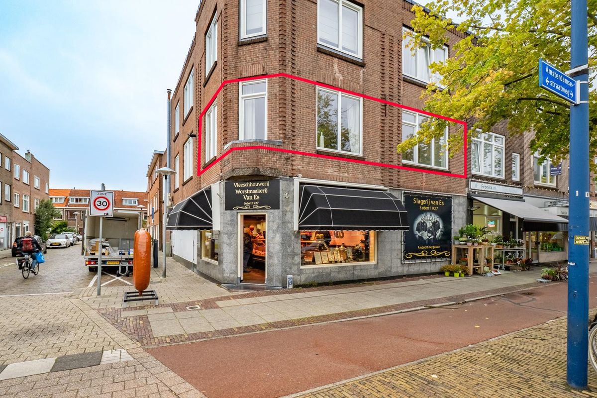 Eerste Verdieping: Entree, en toegang tot alle vertrekken, waaronder een doorzon woonkamer welke gesitueerd is in de hoek. De living beschikt over een royale open keuken welke voorzien is van diverse inbouwapparatuur. Weer terug naar de hal. Hier is een separaat toilet aanwezig met fontein. De badkamer is voorzien van een douche en een wastafel. De voorste slaapkamer kijkt uit op de Amsterdamsestraatweg. Hier zou ook een aparte werk/studeerplek gerealiseerd kunnen worden. De slaapkamer aan de achterzijde heeft openslaande tuindeuren naar het dakterras. Hier is het gezellig met verlichting, beschutting, bestrating en privacy.