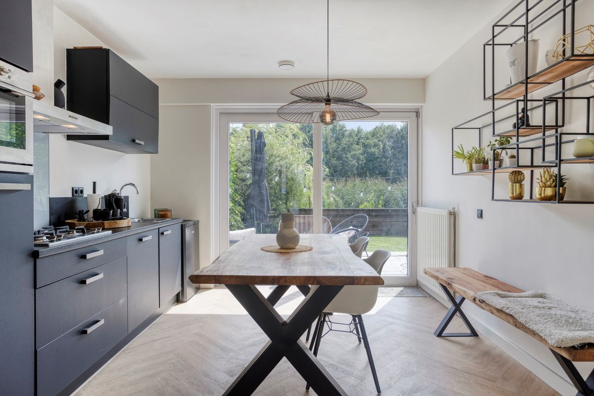 De ruime en compleet ingerichte woonkeuken is voorzien van diverse onder- en bovenkasten en is uitgerust met een 4-pits gasfornuis, rvs afzuigkap, koelkast, vriezer, combi oven en vaatwasser.