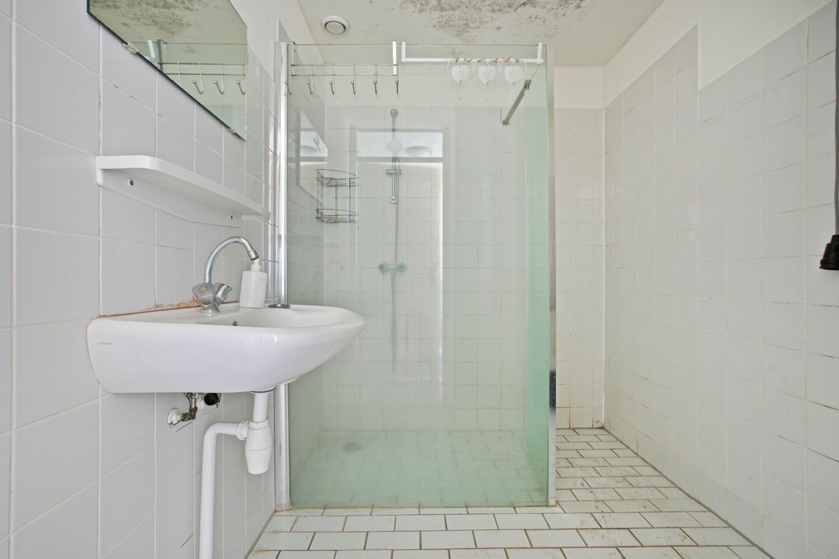 De badkamer is functioneel ingedeeld en beschikt over een douche en een wastafel.