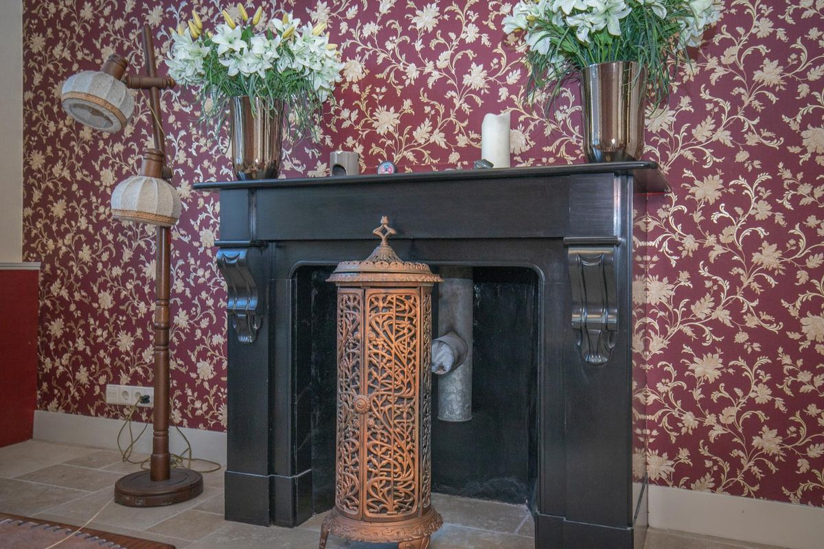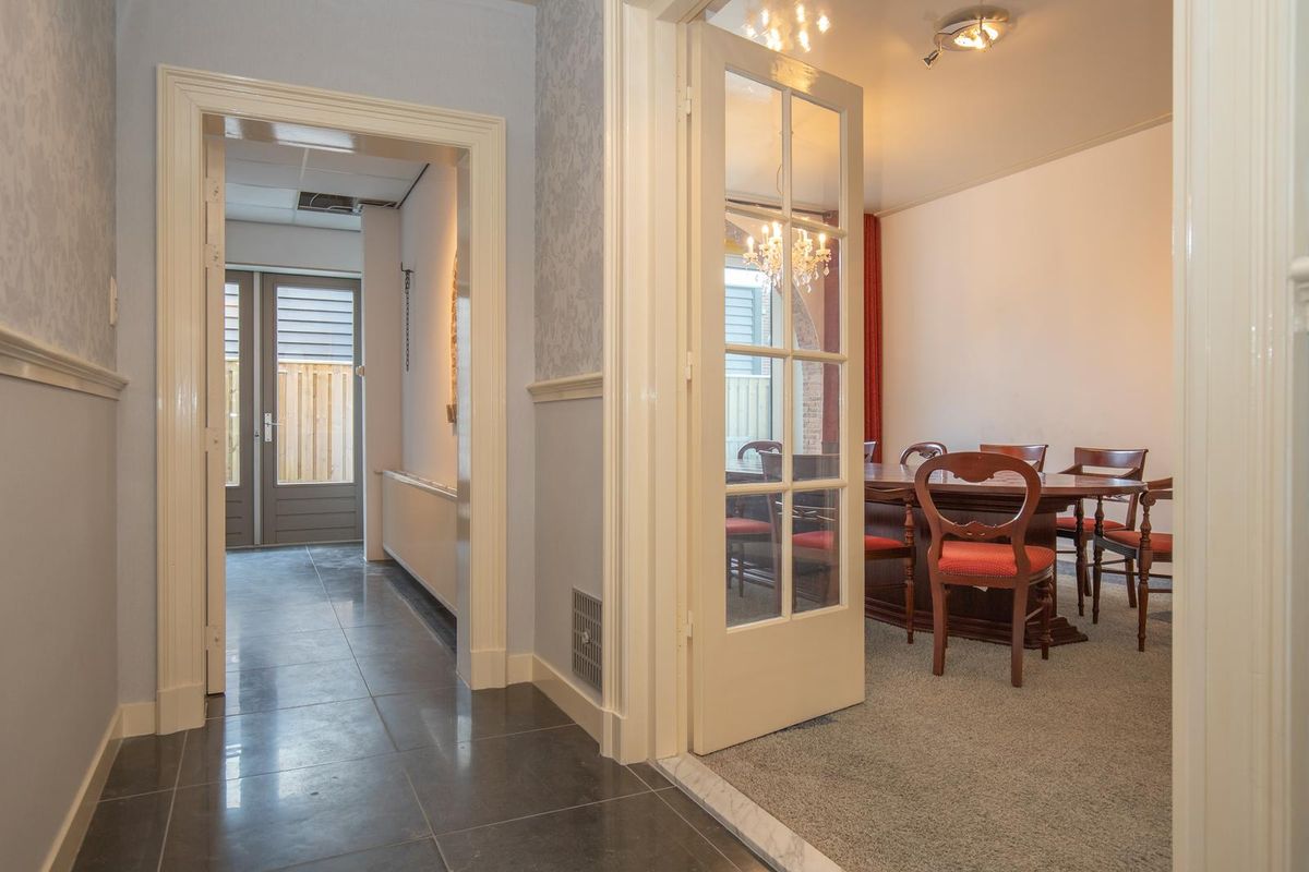 U betreedt de woning via een stijlvol tochtportaal, waarna de imposante hal toegang biedt tot diverse vertrekken. De statige kamer-en-suite met vaste kasten, een sfeervolle schouw en een prachtige plavuizen vloer vormt het hart van de woning. Er zijn twee royale slaapkamers
