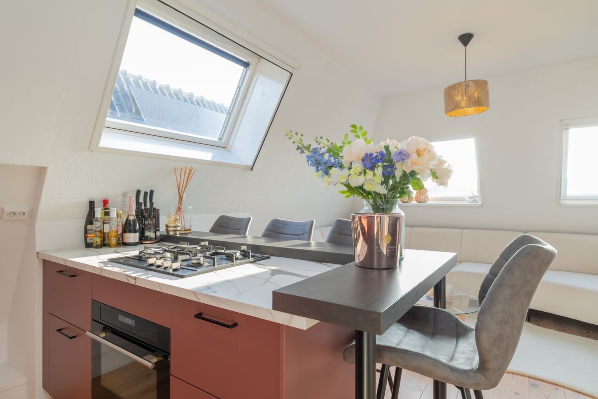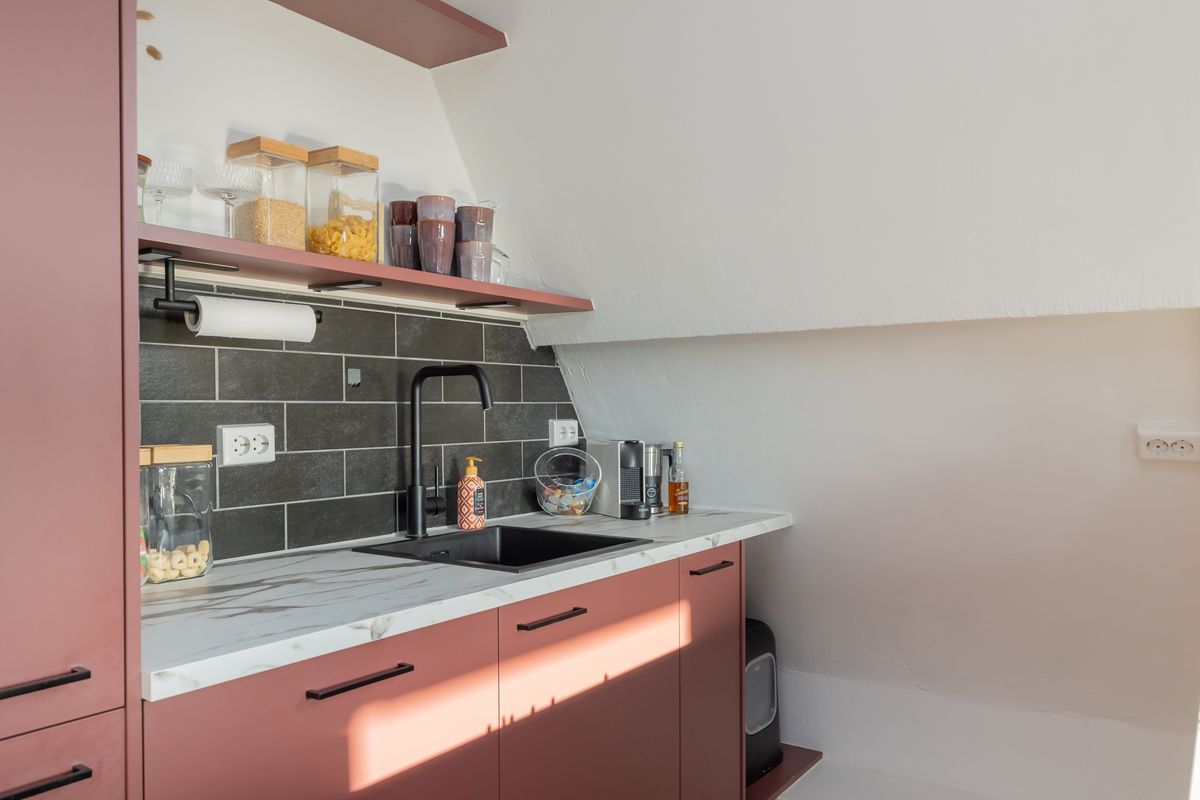 Aan de achterzijde van het appartement vind je de woonkamer met open keuken, voorzien van alle benodigde apparatuur. Dankzij de in 2021 vernieuwde leidingen is de keuken zowel praktisch als stijlvol.