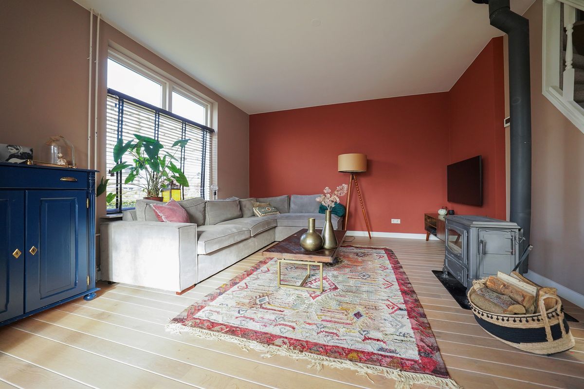 We gaan naar binnen via de mooie zwarte voordeur waar we binnen komen in een open ruimte die ook verbonden is met de woonkamer. Deze ruimte is uitgebouwd met lekker veel raampartijen en dus veel daglicht! De grote stoel verraadt ook al wel hoe heerlijk en zonnig dit plekje is. De woonkamer is aan de voorzijde gelegen en is heel sfeervol ingericht. De mooie houtkachel, de grove plinten, de mooie kozijnen, het kleurgebruik, de houten vloer.. precies de sfeer die ik ook verwacht had en past bij de woning! Door het hoge plafond en de vele raampartijen is het een fijne ruimte om te verblijven. Via de hal en de woonkamer loop ik door naar de gezellige woonkeuken. Deze keuken is volledig vernieuwd in 2021, passend bij de sfeer van de woning. Heel goed gedaan! En wat een gedurfde kleur! De keuken heeft een mooie hoekopstelling en de eettafel staat fijn bij het raam. Er is via de keuken nog een ruime kelder te bereiken voor lekker veel provisie ruimte en het prachtig stallen van de wijnvoorraad zoals je wel op de foto’s kunt zien. De oude paneeldeuren en ook hier de houten vloer ademen weer sfeer uit. Via de keuken komen we in een tussenhalletje waar ik als eerste richting de mooi uitgebouwde ruimte loop wat als grote slaapkamer is ingericht. Slim! Je loopt via de openslaande deuren zo naar de fijne tuin en je hoeft lekker geen trap op! Tegenover de slaapkamer is de vernieuwde badkamer met een grote wastafelmeubel en een ruime inloopdouche. Prachtig gedaan! Ook de toiletruimte is volledig vernieuwd en voorzien van een hangend toilet en fonteintje. Wanneer we de hal verder doorlopen naar de achterzijde komen we in de vernieuwde ruimte wat voorheen een aangebouwde berging was. Wat een fijne ruimte met de open kap en oude balken in het zicht! Ook de ingebouwde kast waar ook ruimte is voor de wasmachine en de droger, is perfect afgewerkt. Een multifunctionele ruimte voorzien van vloerverwarming, nu ook in gebruik als werkkamer. Heel slim!
