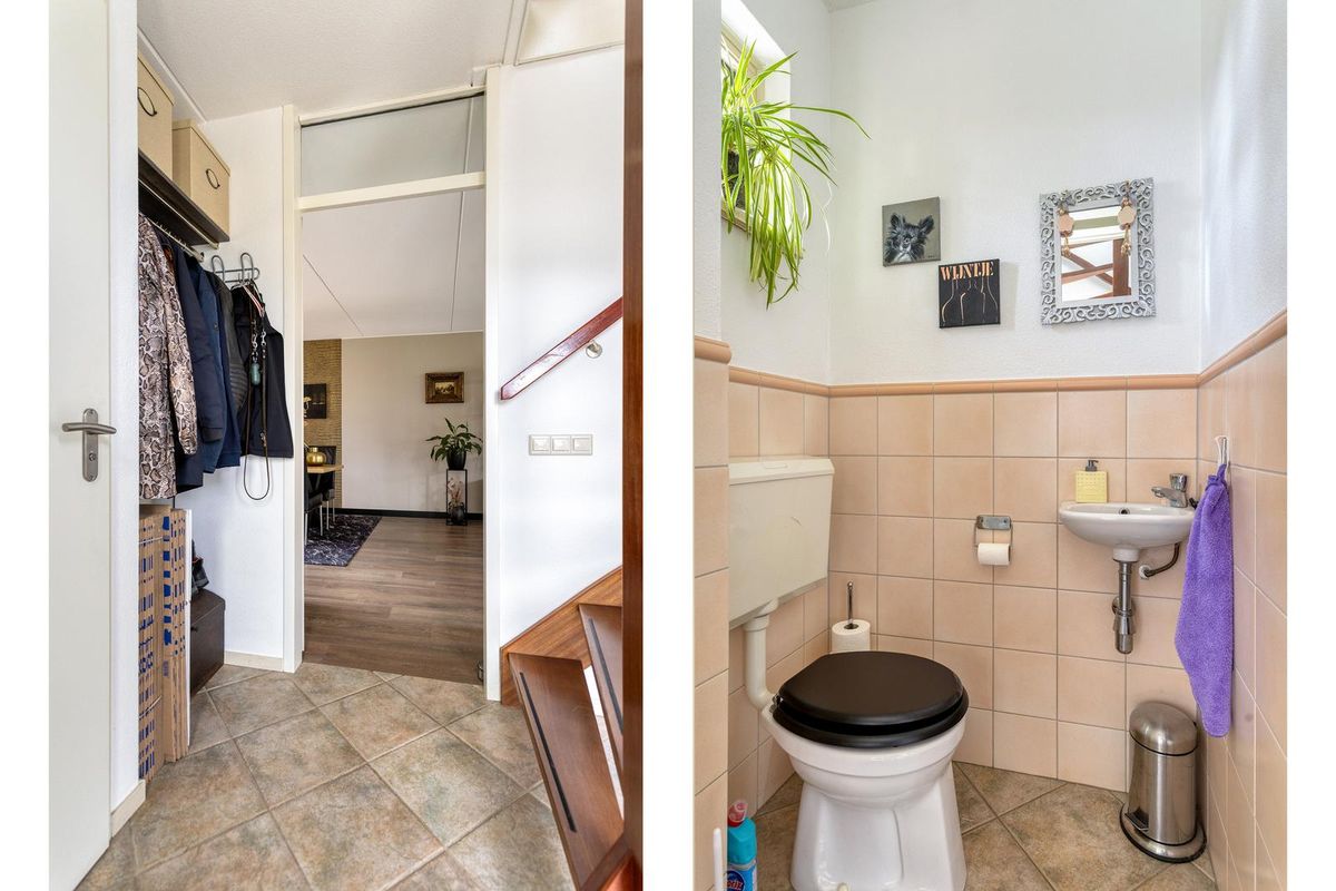 Via de oprit is de overdekte entree van de woning te bereiken. Hal met trapopgang naar de 1e verdieping en garderobenis, toiletruimte met toilet en fontein, toegang naar de woonkamer.