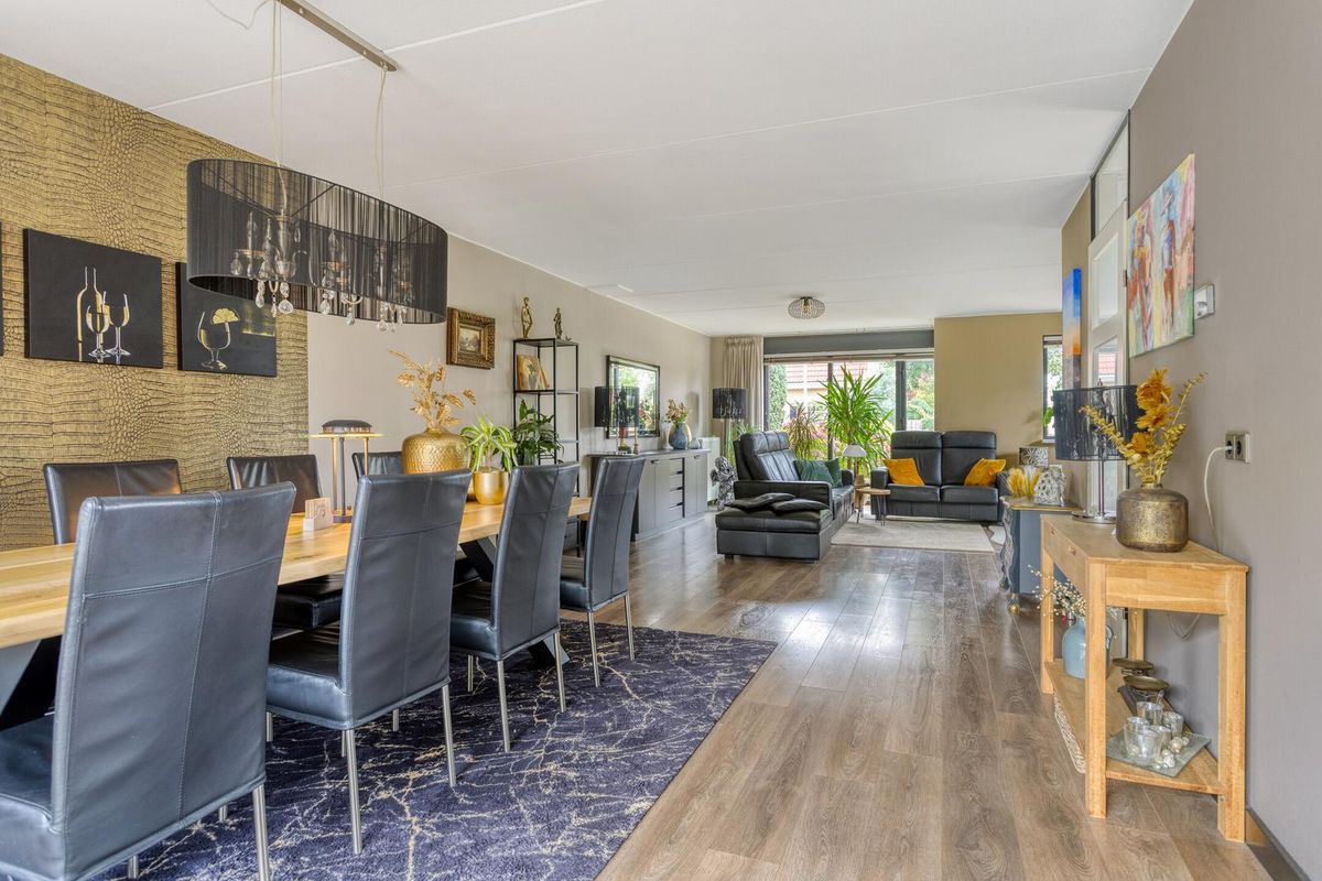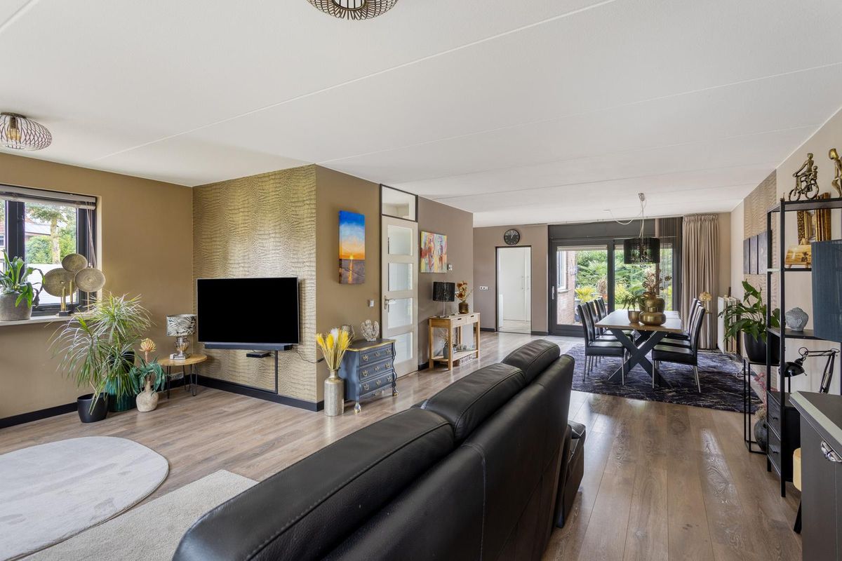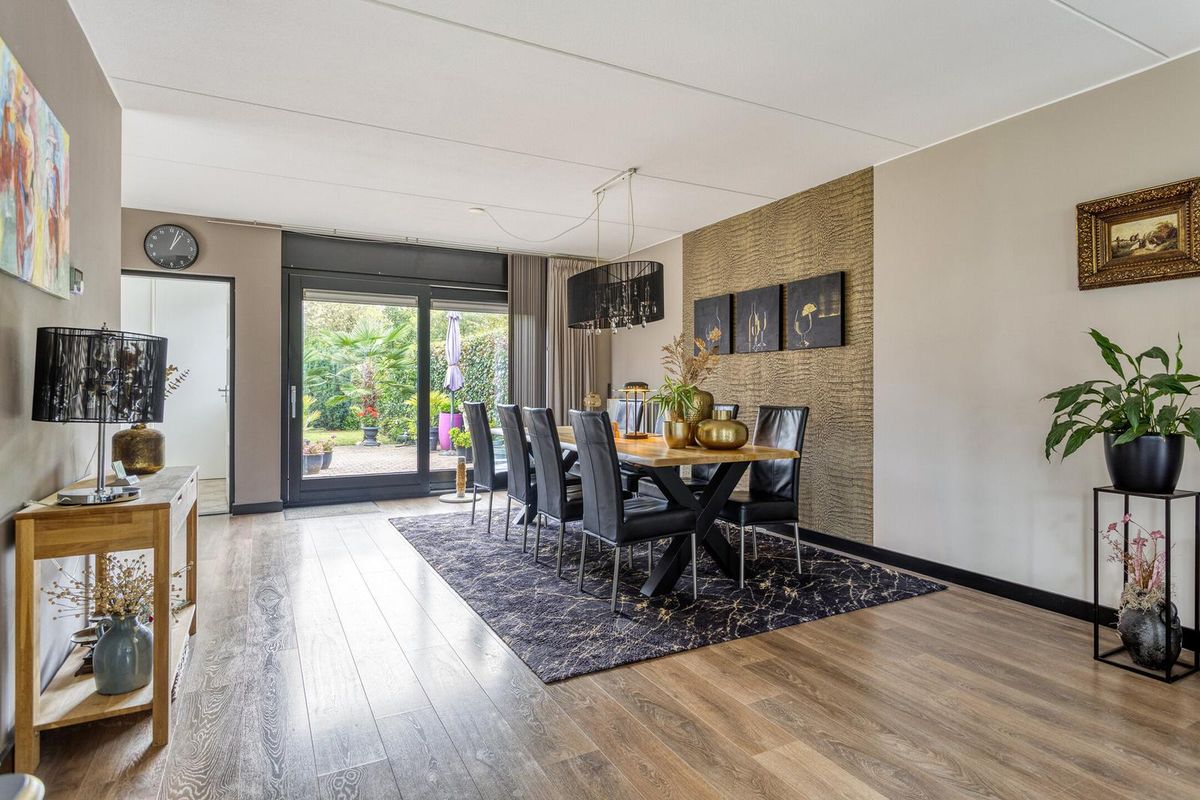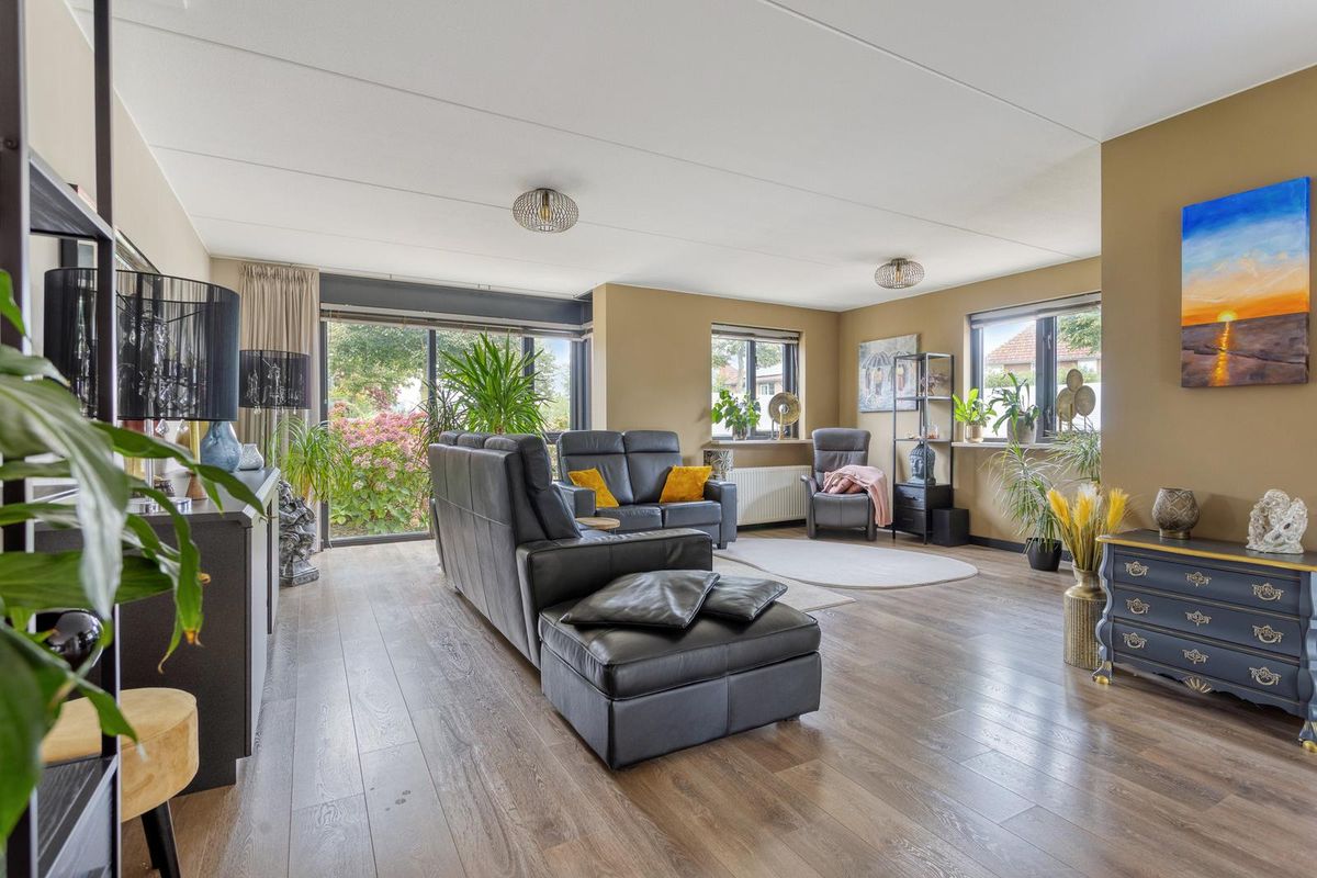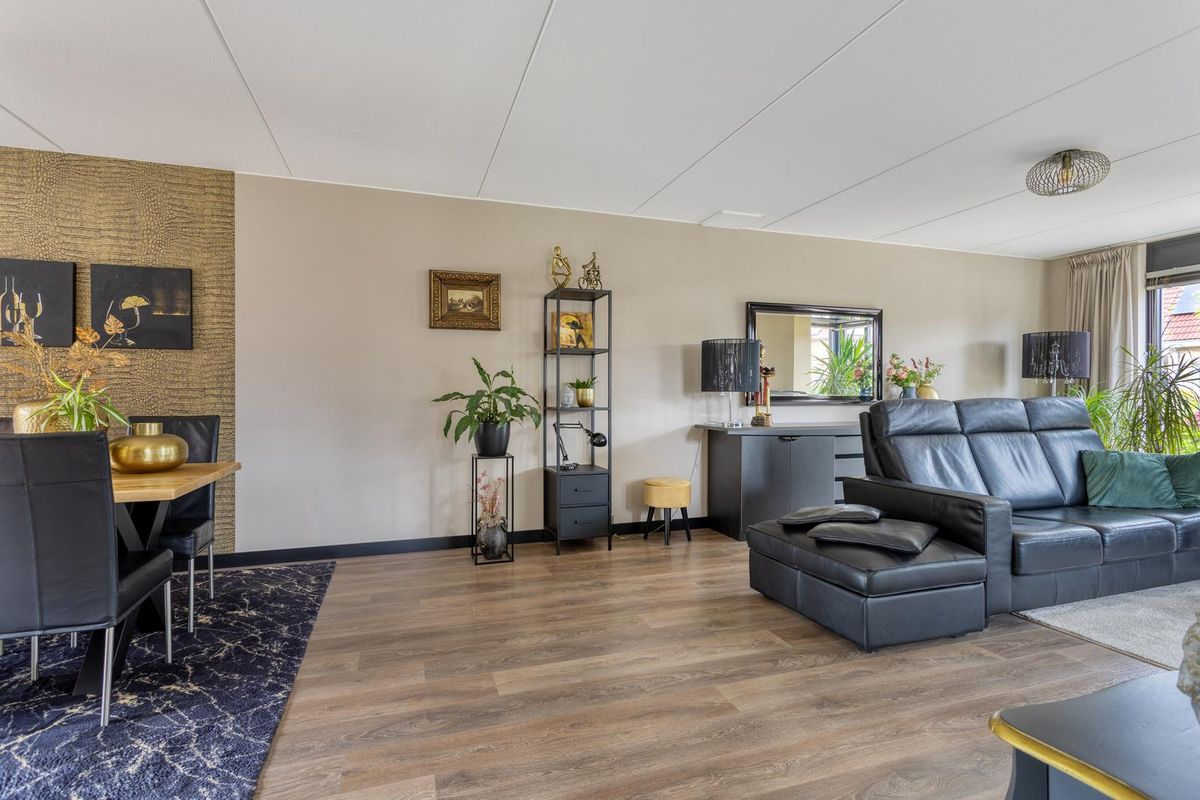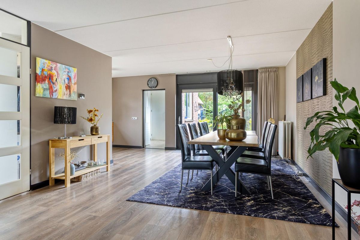 Ruime L-vormige woonkamer met speelse erker met glaspartijen tot aan de grond aan de voorzijde van de woning. Door deze glaspartijen en de extra ramen, is er volop lichtinval in de woonkamer. Ook is er vanuit de woonkamer fraai zicht over de Voorweem en Weem. Door de ruime opzet van de woonkamer is er ruimte voor een grote zithoek en 8-persoons eettafel. De eethoek is aan de achterzijde van de woning gesitueerd. In de achtergevel is een glazen schuifpui geplaatst, hierdoor is er ook mooi zicht over de achtertuin. Door de schuifpui is het binnen- en buitenleven uitstekend te combineren.