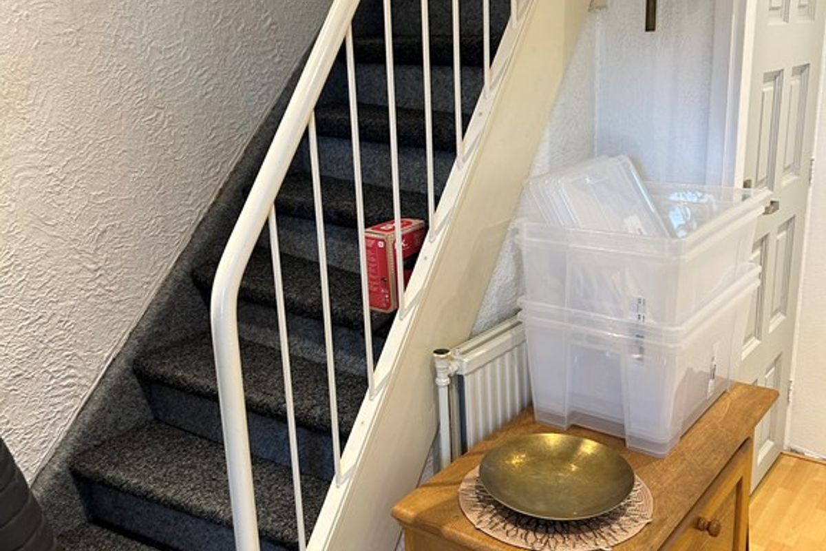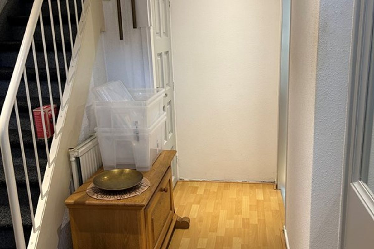 Entree/gang 4,20 x 1,05 met laminaatvloer, nieuwe meterkast met slimme stroommeter, garderobe, gastentoilet 1,20 x 0,80 met duoblok en fonteintje, deur naar woonkamer en kelder en trap naar verdieping.