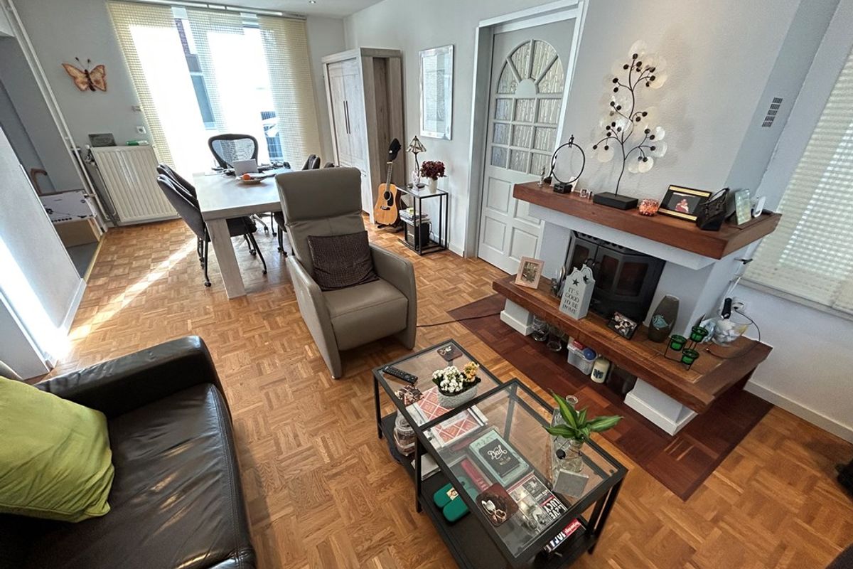 Woonkamer 7,35 x 3,60 met parketvloer, inbouwspots, houtkachel, schuifpui naar achtertuin, schuifdeur naar aanbouw en open keuken.