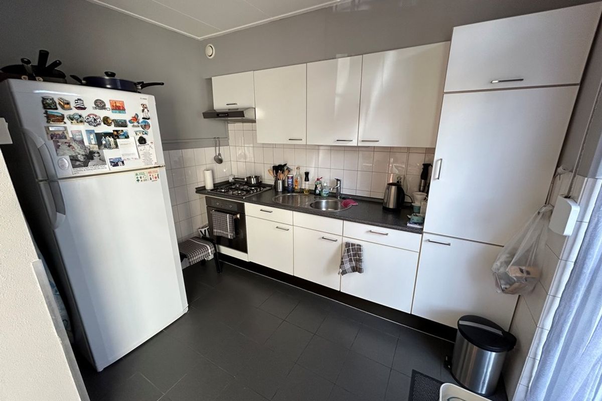 Keuken 3,05 x 2,20 met plavuizenvloer, deur naar achtertuin en aanbouwkeuken met 4-pits gasfornuis met afzuigunit, heteluchtoven, koel/vriescombinatie en spoelbak.