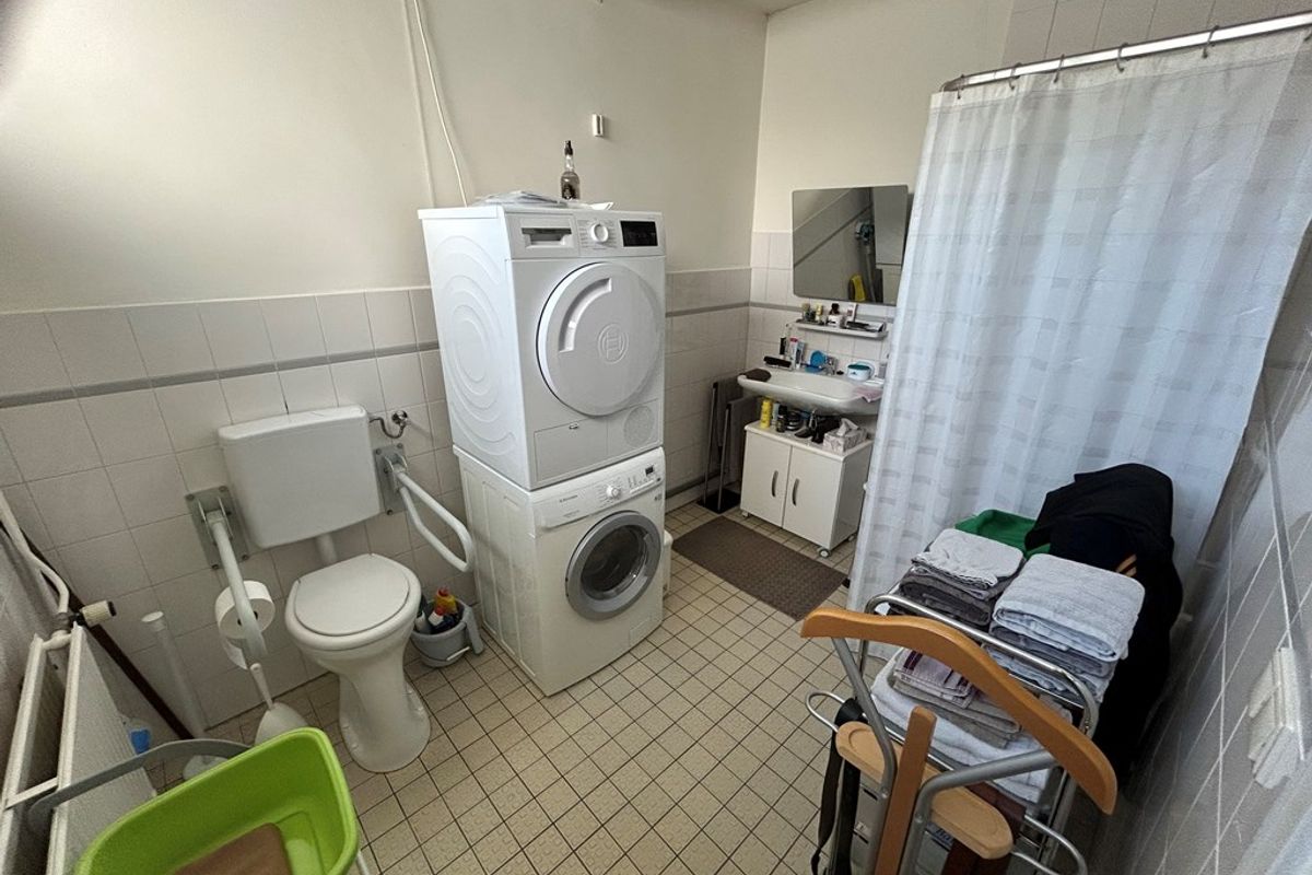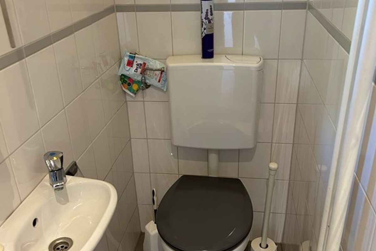 Badkamer 1: 3,15 x 2,20 met plavuizenvloer, inloopdouche met tillift, toilet, wastafel en aansluitingen was-apparatuur.