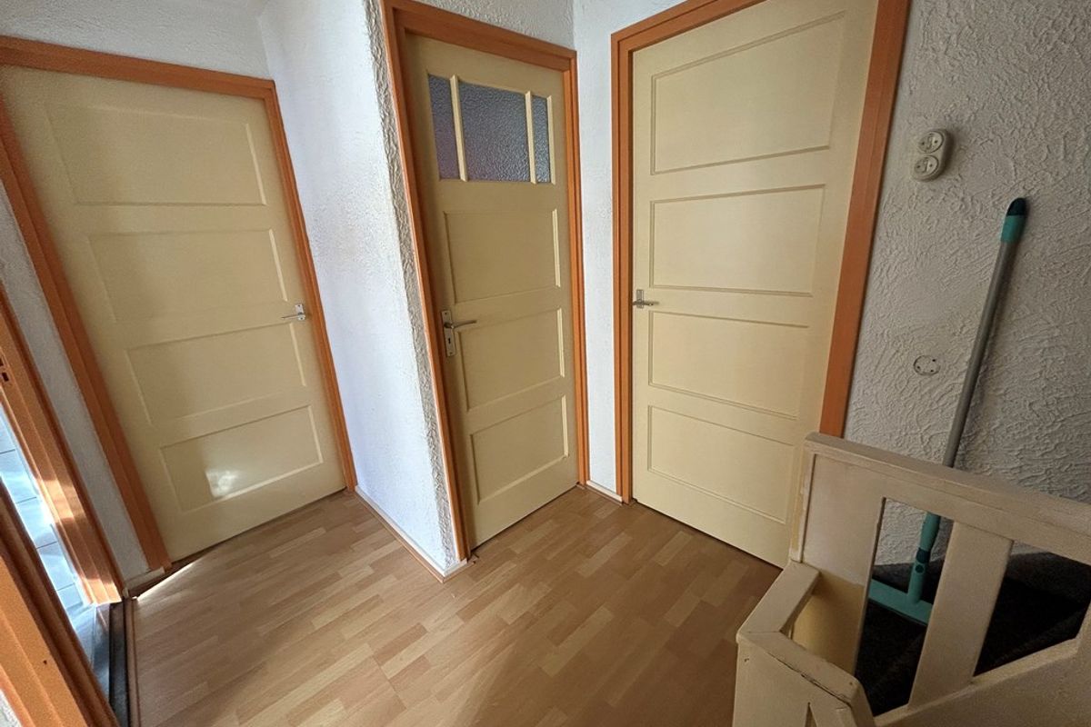 Overloop 1,90 x 2,35/1,25 met laminaatvloer en vaste trap naar tweede verdieping.