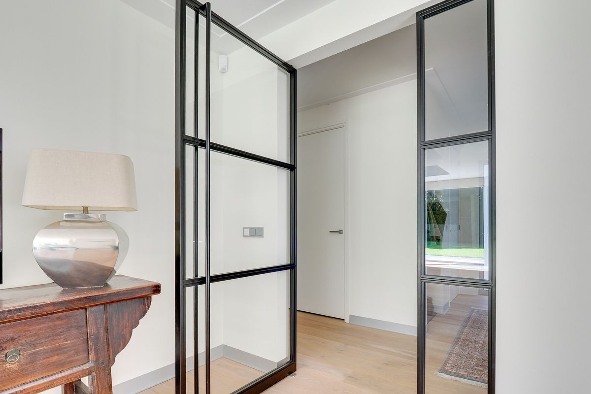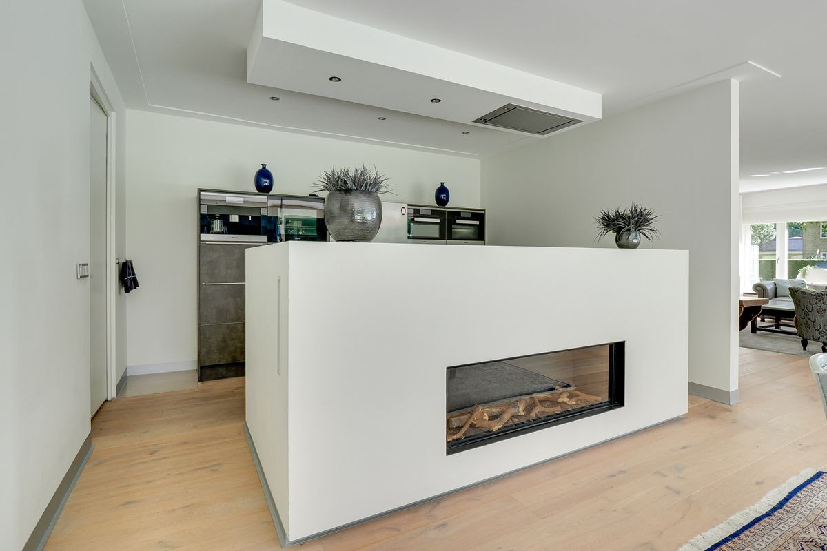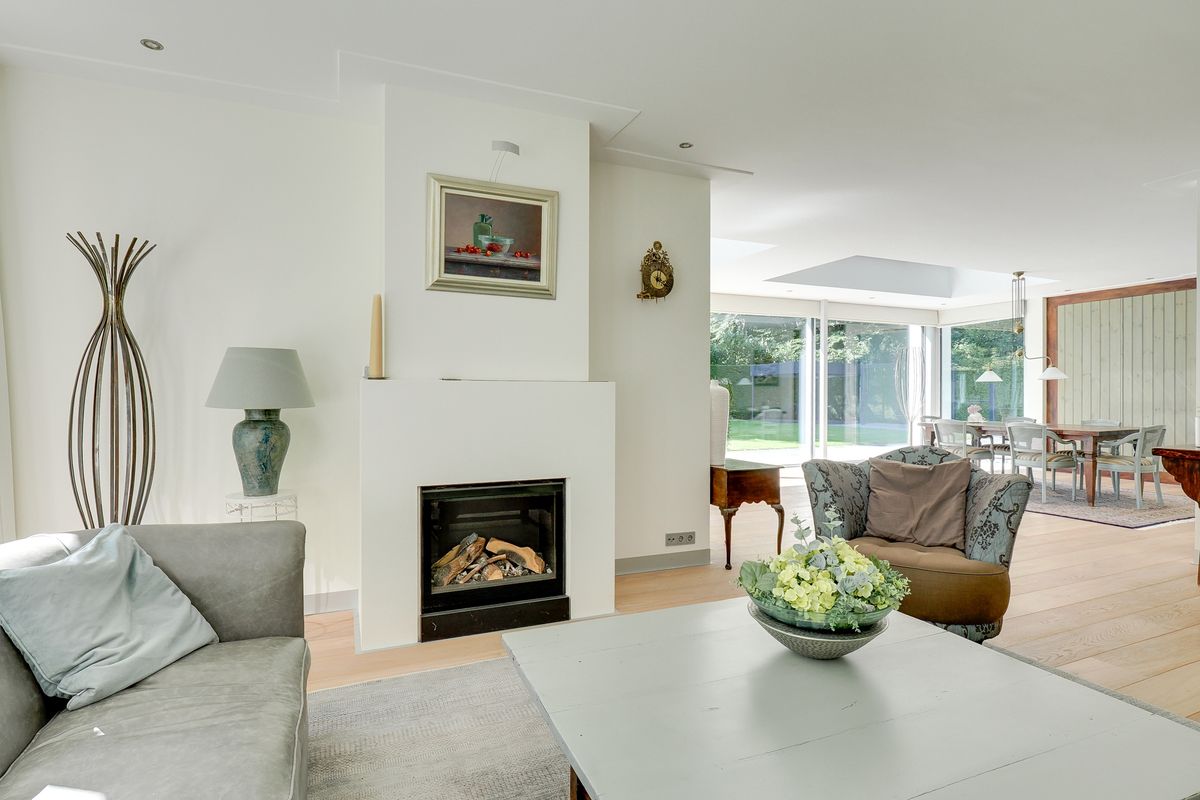 You enter into a spacious entrance hall with sturdy glass doors leading to the living areas. From here, you walk into the living room. It has oak flooring with underfloor heating, which is nice and cozy and sustainable. The living room is bathed in light thanks to the many windows. Sliding doors and floor-to-ceiling windows seamlessly connect the living areas to the terrace and garden. The large windows in particular allow the greenery to come inside. The gas fireplaces provide cosiness on the colder days. The open kitchen is modern and equipped with the best appliances (Miele), including a wine cooler. While you cook, you can keep in touch with your loved ones. On the kitchen side, a door leads to the master bedroom with its own spacious walk-in closet and luxurious bathroom. Here you sleep at the rear of the house, so peace and quiet is always guaranteed. The adjoining luxurious and attractive bathroom has a double sink, a spacious walk-in shower, and a bathtub with a gas fireplace. Bathing becomes the ultimate wellness experience. The villa has two other bedrooms and a second bathroom in the same style as the other bathroom. From the house, there is also access to the spacious indoor garage with an electric roller door. Your car will stay nice and dry. All these rooms are located on the ground floor, which makes life very easy.
