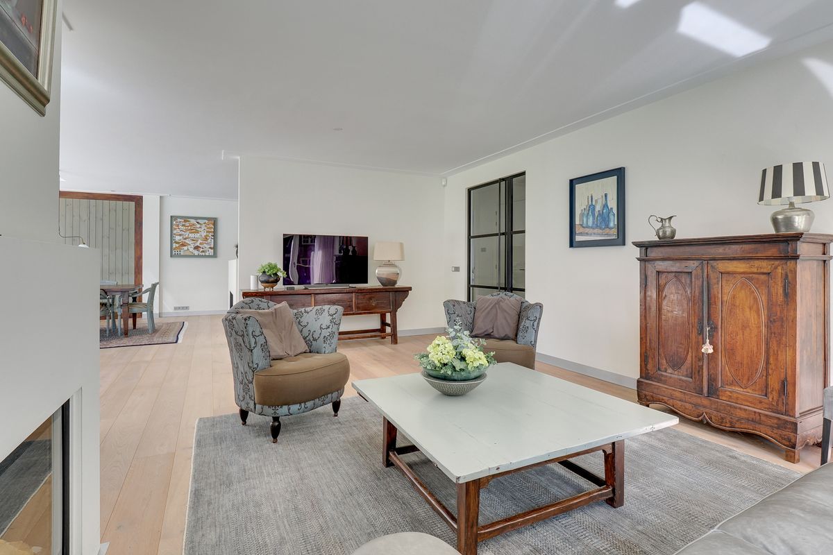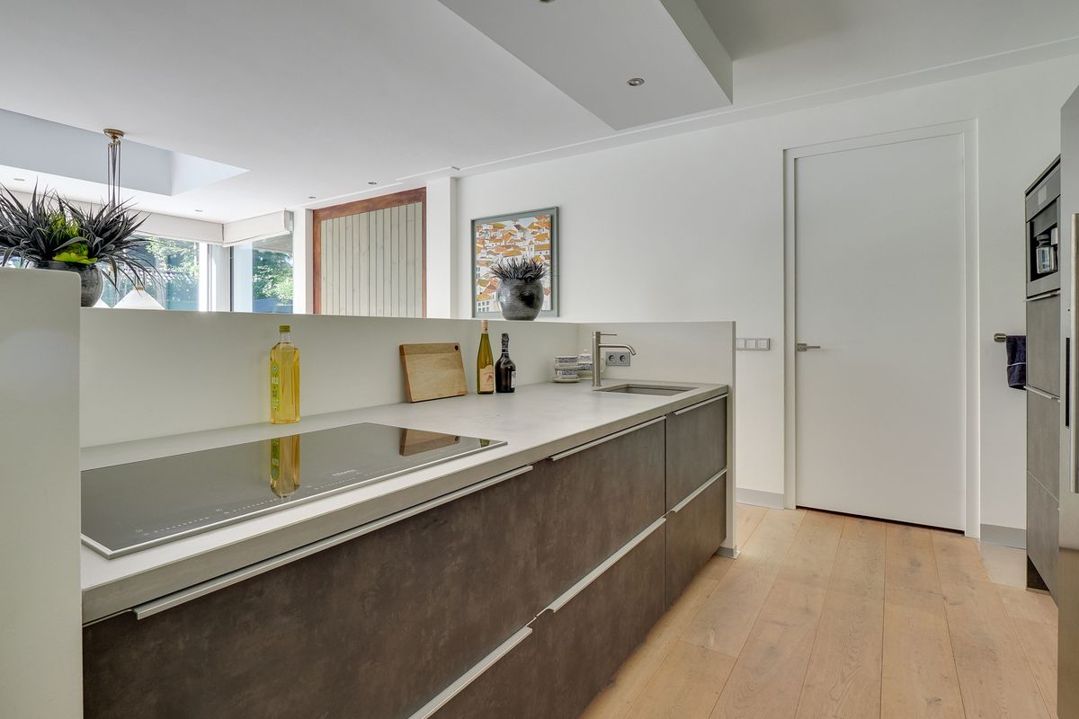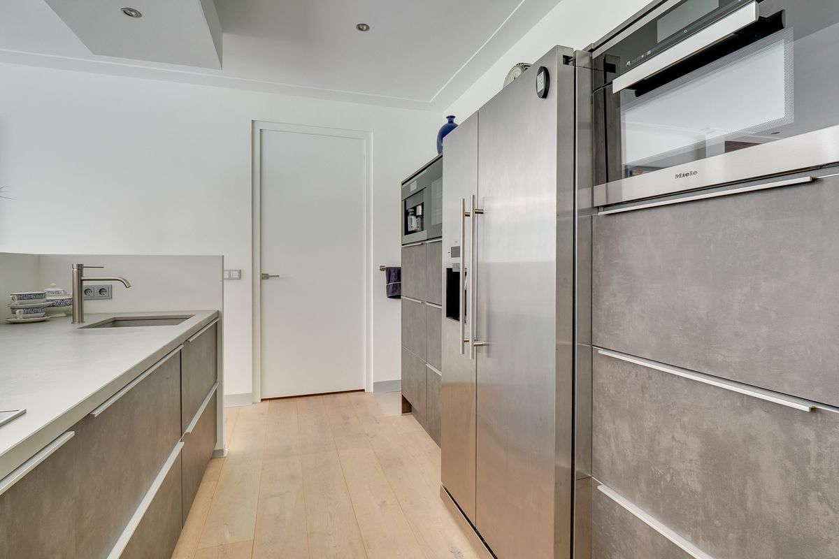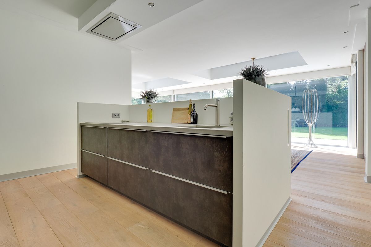You enter into a spacious entrance hall with sturdy glass doors leading to the living areas. From here, you walk into the living room. It has oak flooring with underfloor heating, which is nice and cozy and sustainable. The living room is bathed in light thanks to the many windows. Sliding doors and floor-to-ceiling windows seamlessly connect the living areas to the terrace and garden. The large windows in particular allow the greenery to come inside. The gas fireplaces provide cosiness on the colder days. The open kitchen is modern and equipped with the best appliances (Miele), including a wine cooler. While you cook, you can keep in touch with your loved ones. On the kitchen side, a door leads to the master bedroom with its own spacious walk-in closet and luxurious bathroom. Here you sleep at the rear of the house, so peace and quiet is always guaranteed. The adjoining luxurious and attractive bathroom has a double sink, a spacious walk-in shower, and a bathtub with a gas fireplace. Bathing becomes the ultimate wellness experience. The villa has two other bedrooms and a second bathroom in the same style as the other bathroom. From the house, there is also access to the spacious indoor garage with an electric roller door. Your car will stay nice and dry. All these rooms are located on the ground floor, which makes life very easy.