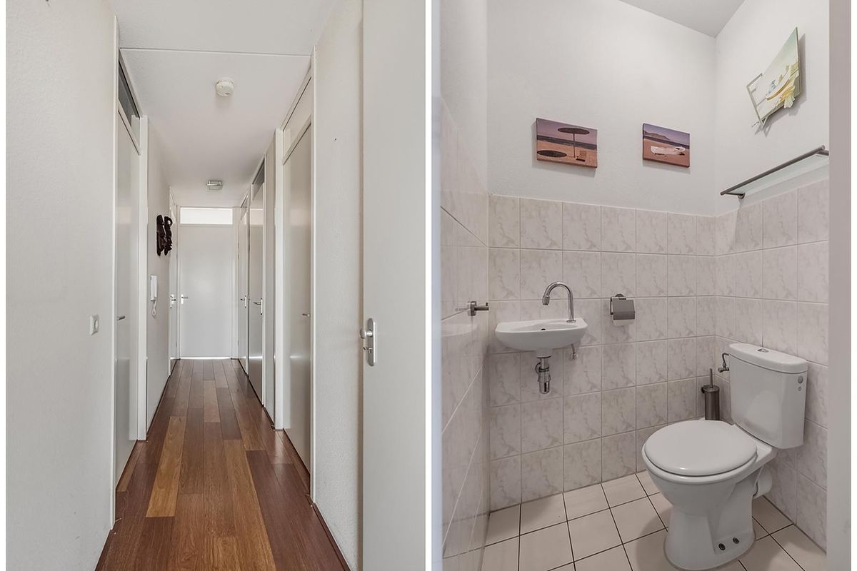 Via de overdekte galerij is het appartement te betreden. Entree, hal met meterkast en toegang tot alle vertrekken, toiletruimte voorzien van een duoblok toilet en fonteintje. De toiletruimte is gedeeltelijk betegeld in een neutrale kleurstelling.