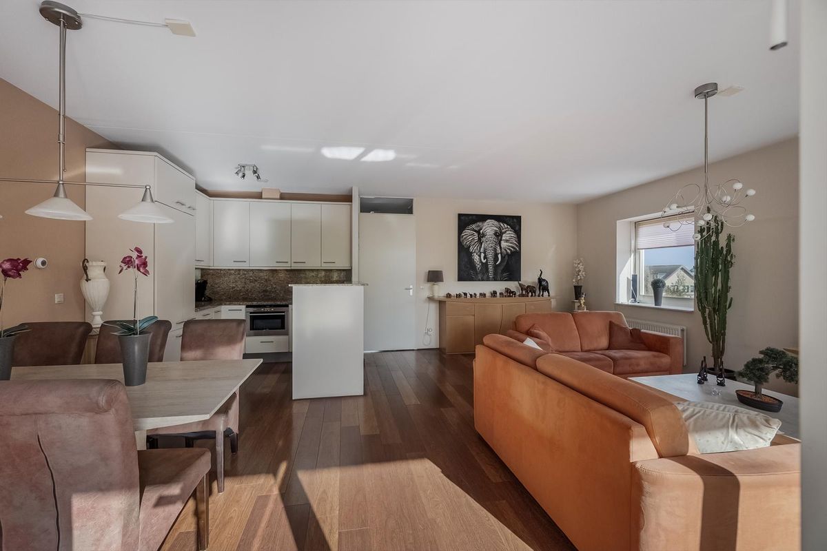 De moderne open keuken is uitgevoerd in een L-opstelling en voorzien van diverse inbouwapparatuur zoals een koelkast, keramische kookplaat, afzuigkap, combimagnetron en een vaatwasser. Verder is de keuken voorzien van een enkele spoelbak en een apotheekkast. Het geheel is uitgevoerd in wit en is afgewerkt met een granieten aanrechtblad, laminaatvloer, spotjes en sfeerverlichting.