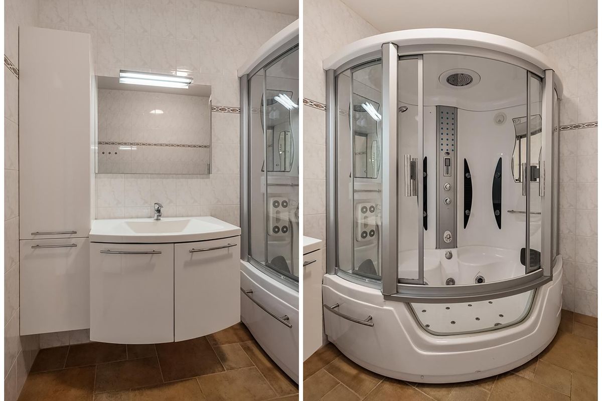 Badkamer (ca. 6 m2) met sanitaire voorzieningen zoals een wastafel met wastafelmeubel, spiegel, verlichting, een extra vaste kast voor de handdoeken en een douchecabine. De badkamer is geheel betegeld in een lichte kleurstelling.