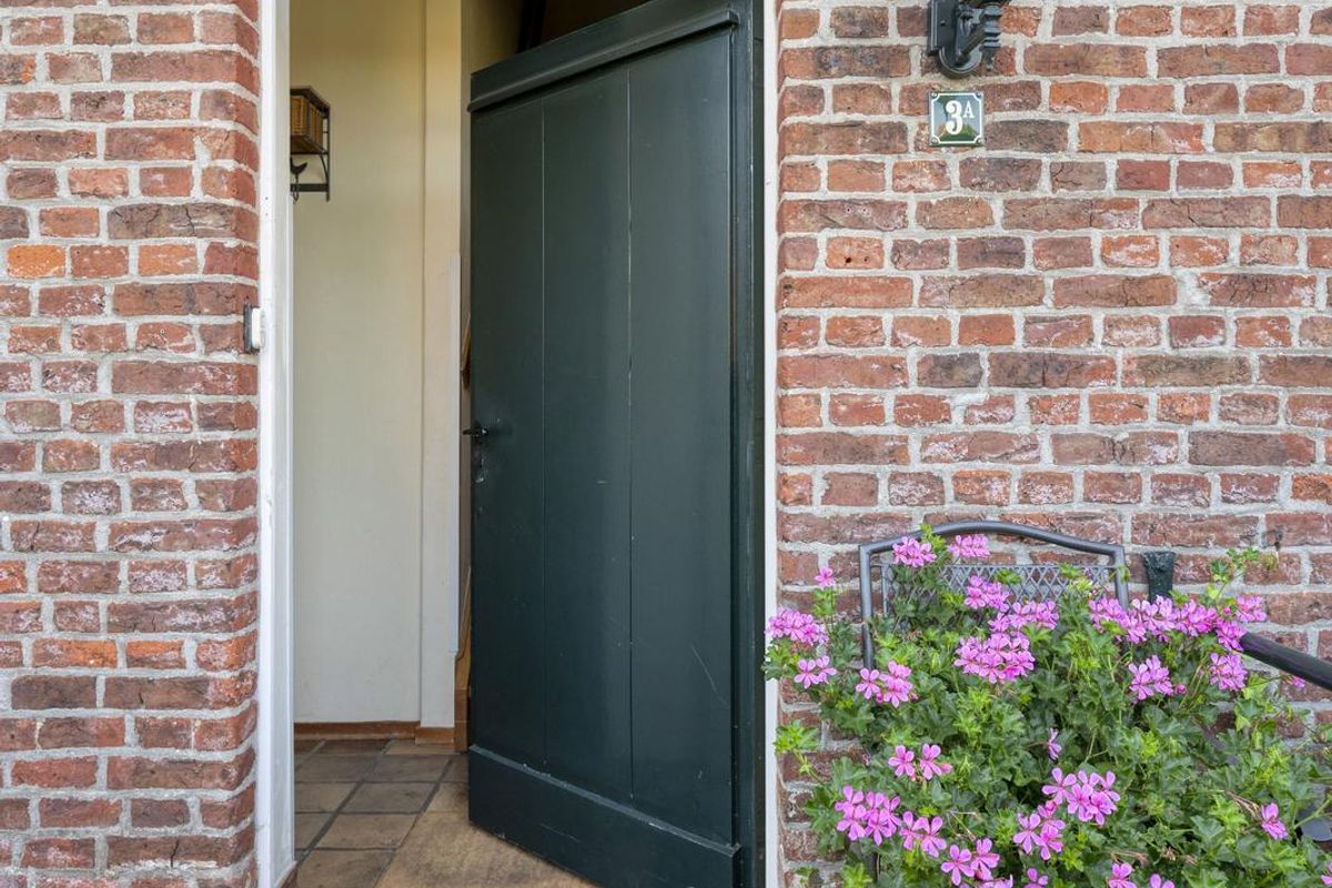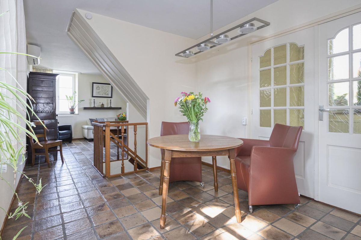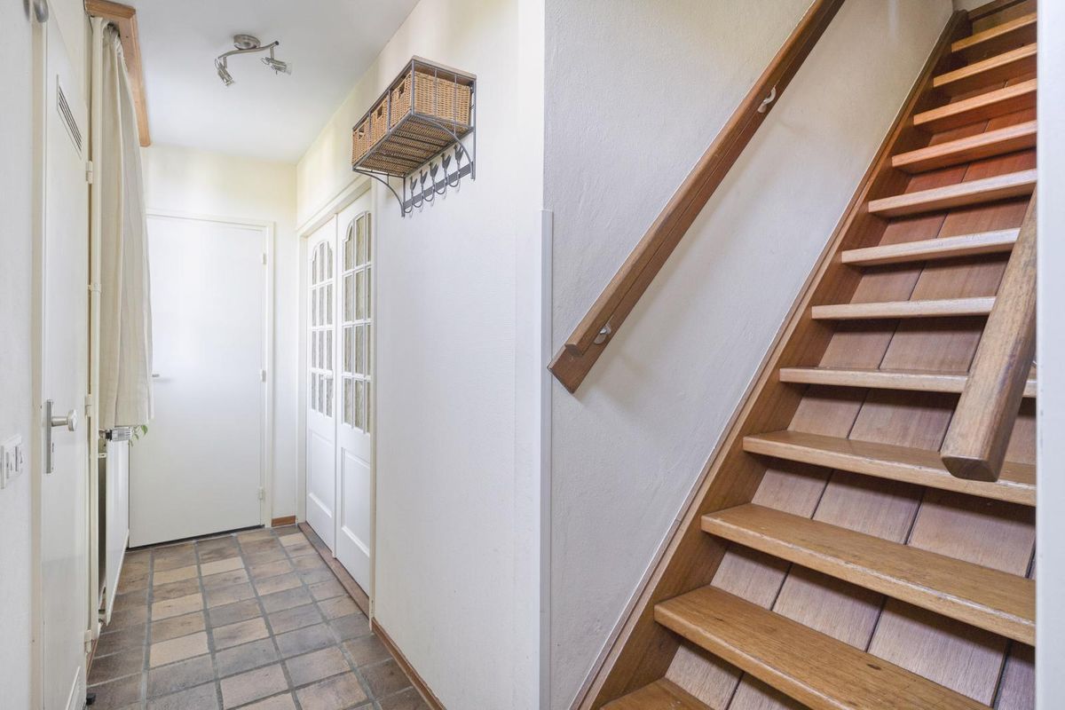 Rechts van de vier parkeerplaatsen is een buitentrap die naar de voordeur van deze woning leidt. Je ziet direct dat dit een huis met karakter is, met een dorpel van hardsteen en muurankers boven de entree. In de ruime hal zijn de meterkast, de toiletruimte met fonteintje en de hardhouten trap naar de eerste verdieping.