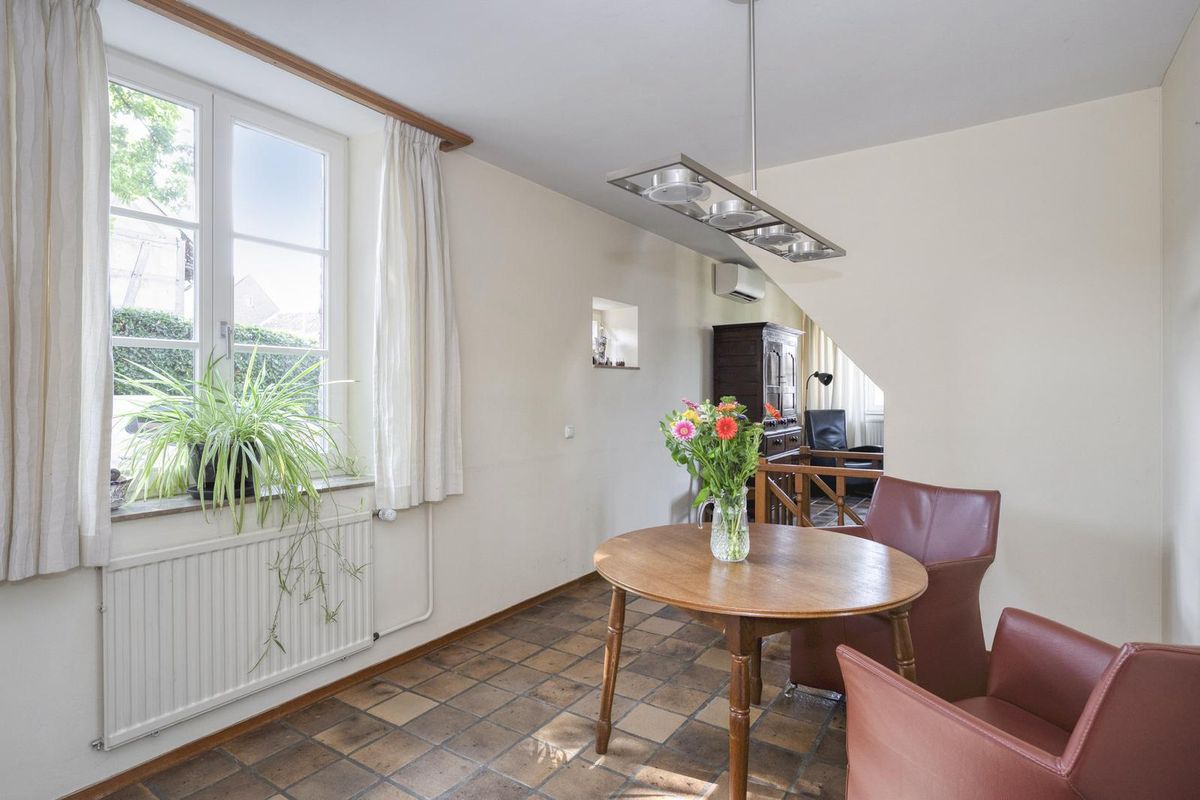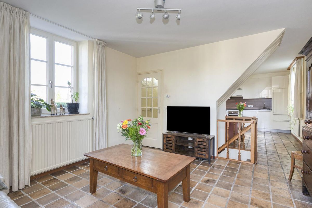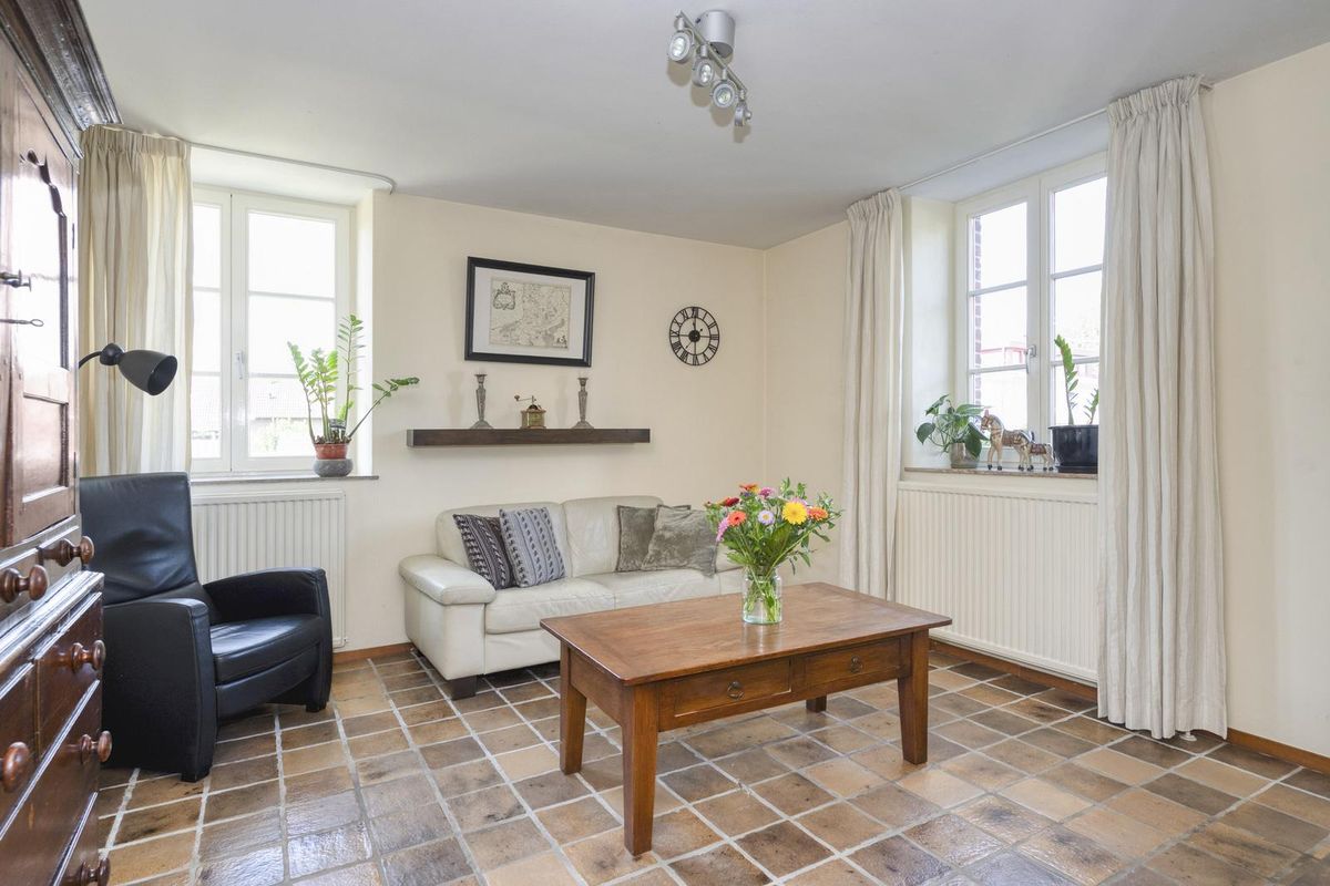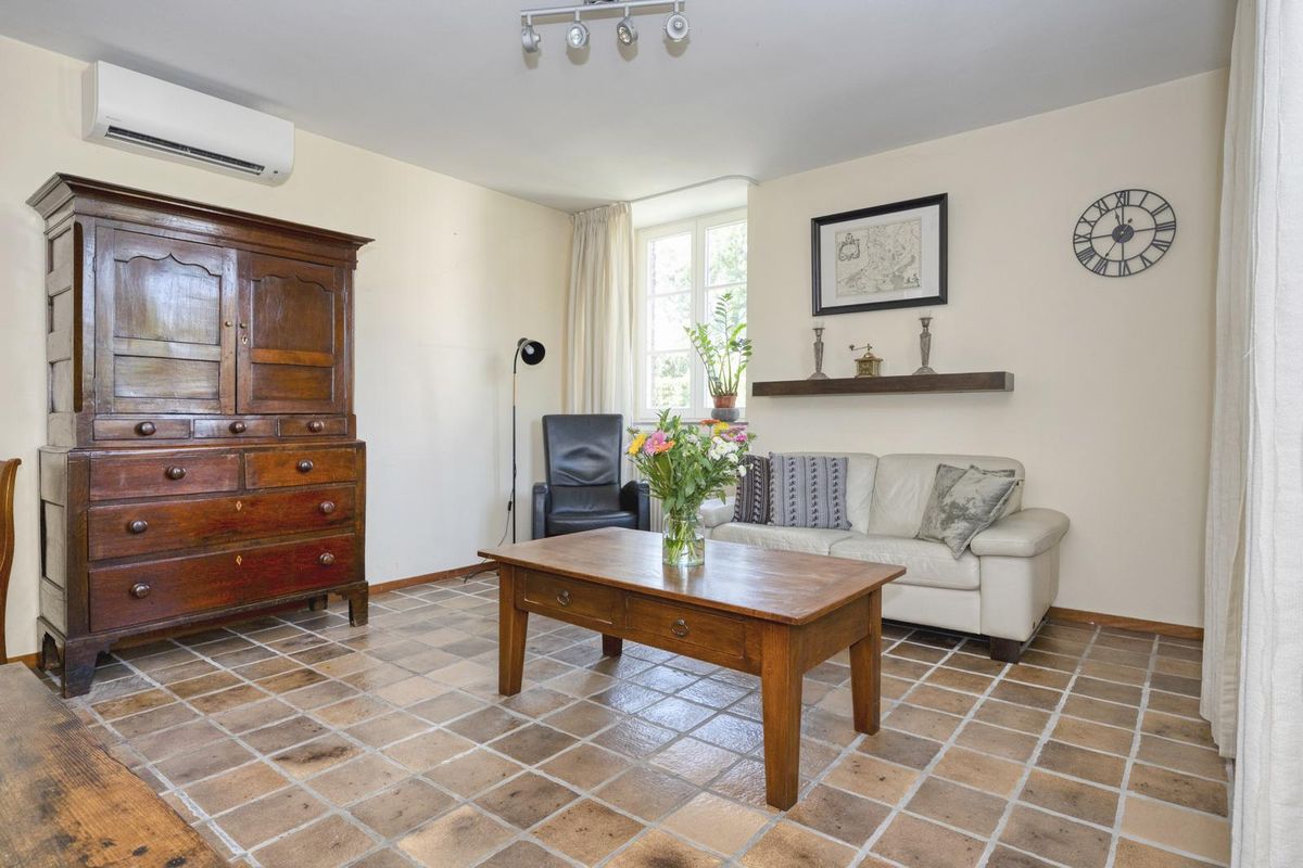 De woonkamer bevindt zich aan de voorzijde, met ramen aan beide zijden en een mooi uitzicht naar de tuin. Net als in de hal ligt ook hier een plavuizen vloer, die qua stijl goed past bij dit woonhuis met karakter. Boven de antieke kast hangt een Daikin airco-unit, die kan koelen en verwarmen.