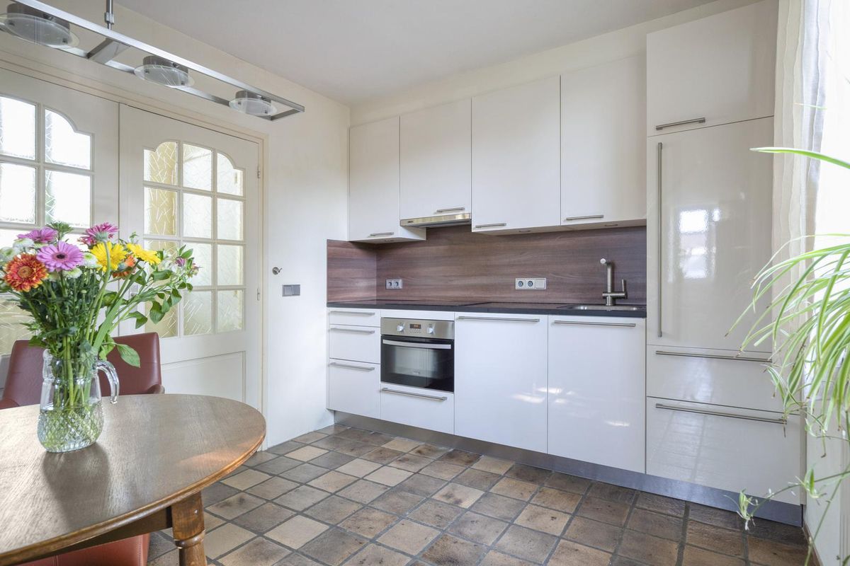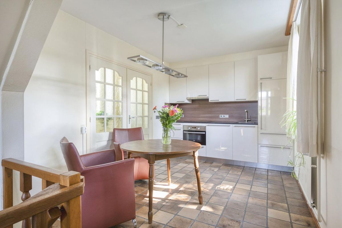 Naast de trap, die naar de gewelfde kelder leidt, is een doorgang naar de eetkeuken. Dit is een gezellige plek in huis, waar je niet alleen kookt en eet maar waar bezoek ook aanschuift voor een kop koffie of thee, uiteraard met een stuk Limburgse vlaai. De keukenopstelling (2014) heeft een ingebouwde inductie kookplaat, afzuigkap, combi-oven, vaatwasser en een koelkast.