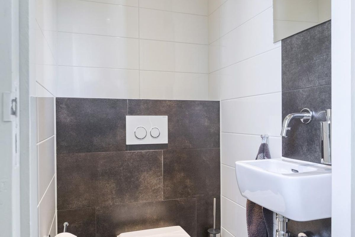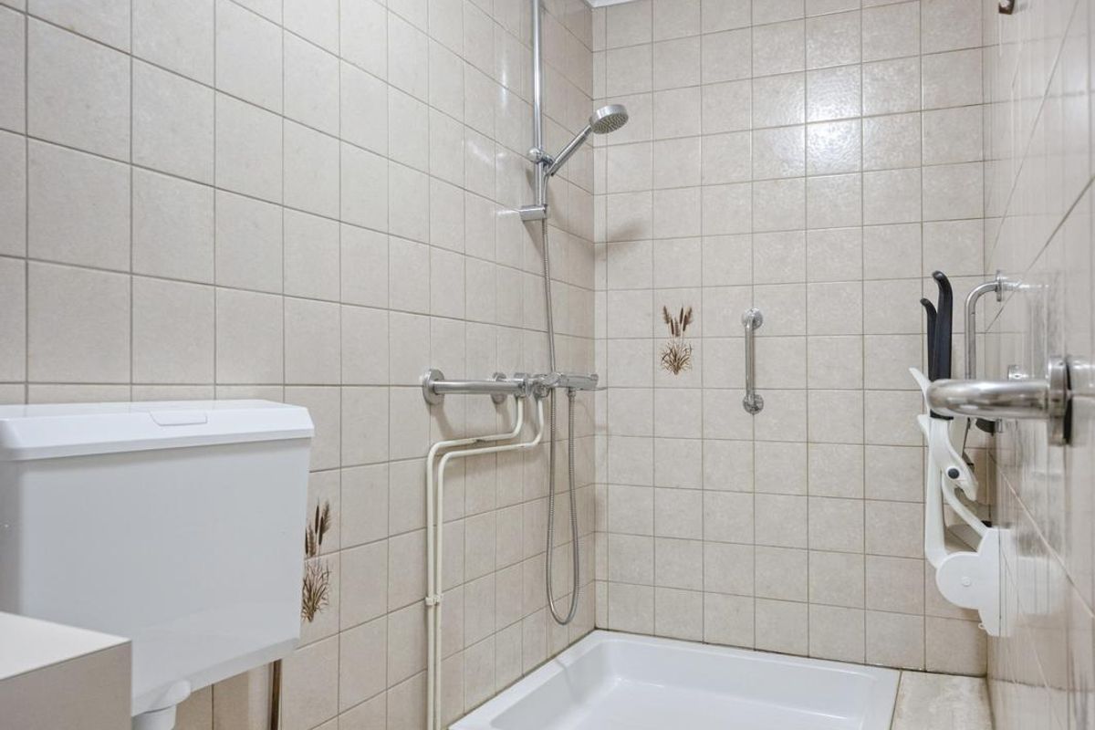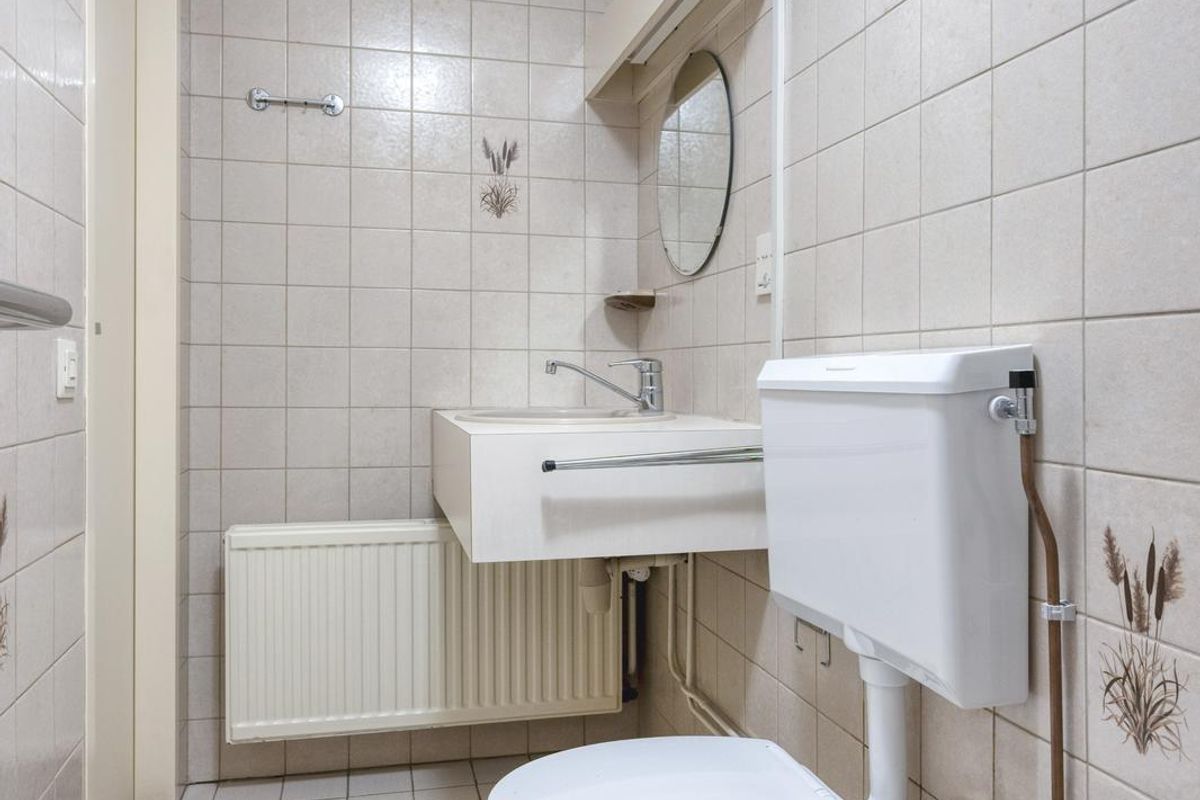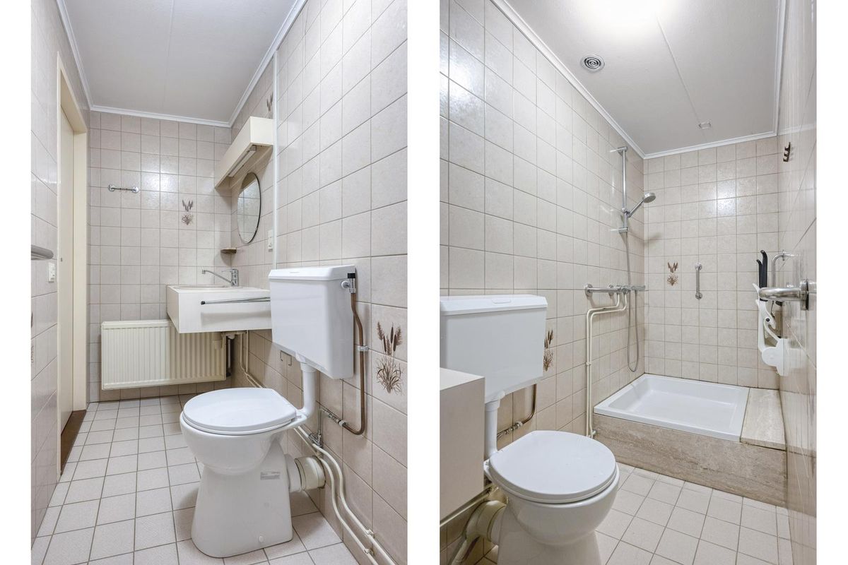 De laatste ruimte op deze verdieping is de badkamer, waarvan de douchebak en het toilet in 2023 zijn vernieuwd. Verder ziet u typische jaren ’80 wandtegels, lichte vloertegels en een grote wastafel met meubel.