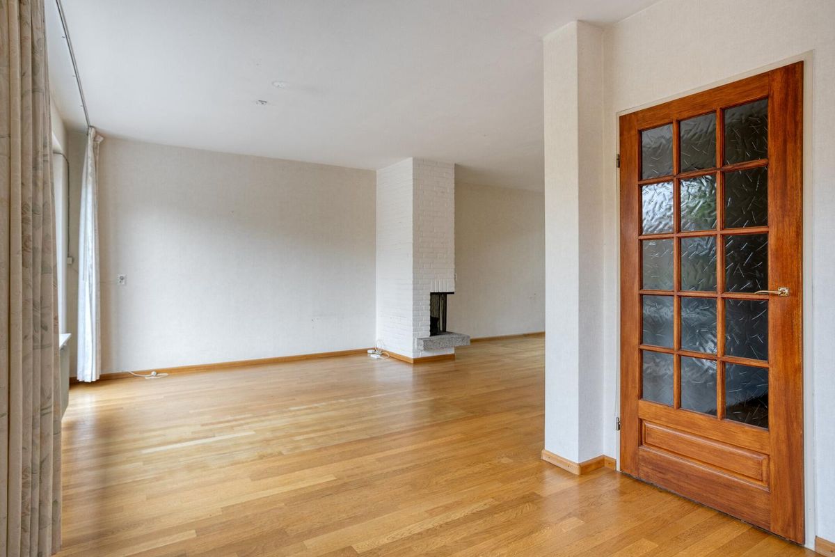 De woonkamer is afgewerkt met behang op de muren en heeft een parketvloer.